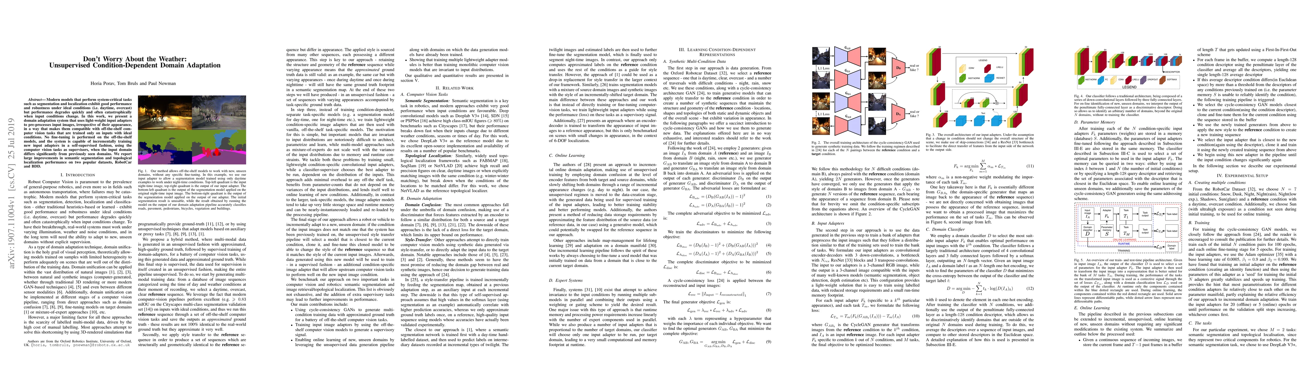 Modern models that perform system-critical tasks such as segmentation and localization exhibit good performance and robustness under ideal conditions (i.e. daytime, overcast) but performance degrades quickly and often catastrophically when input conditions change. In this work, we present a domain adaptation system that uses light-weight input adapters to pre-processes input images, irrespective of their appearance, in a way that makes them compatible with off-the-shelf computer vision tasks that are trained only on inputs with ideal conditions. No fine-tuning is performed on the off-the-shelf models, and the system is capable of incrementally training new input adapters in a self-supervised fashion, using the computer vision tasks as supervisors, when the input domain differs significantly from previously seen domains. We report large improvements in semantic segmentation and topological localization performance on two popular datasets, RobotCar and BDD.