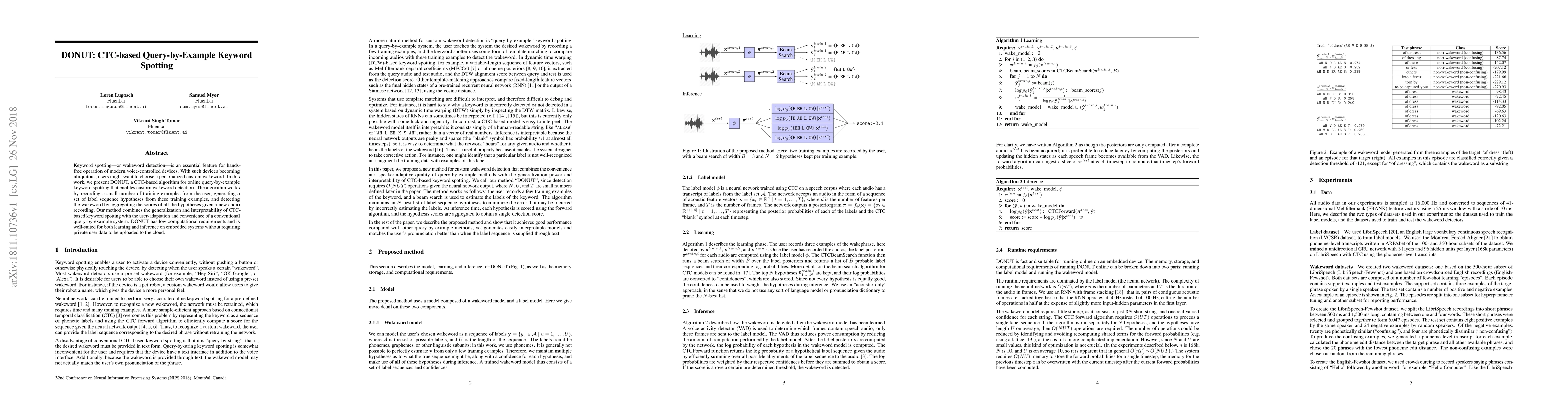DONUT is a CTC-based algorithm for personalized, online keyword spotting, enabling custom wakeword detection using minimal user training examples. It combines the strengths of CTC for generalization and query-by-example systems for user adaptation, with low computational demands suitable for embedded devices.