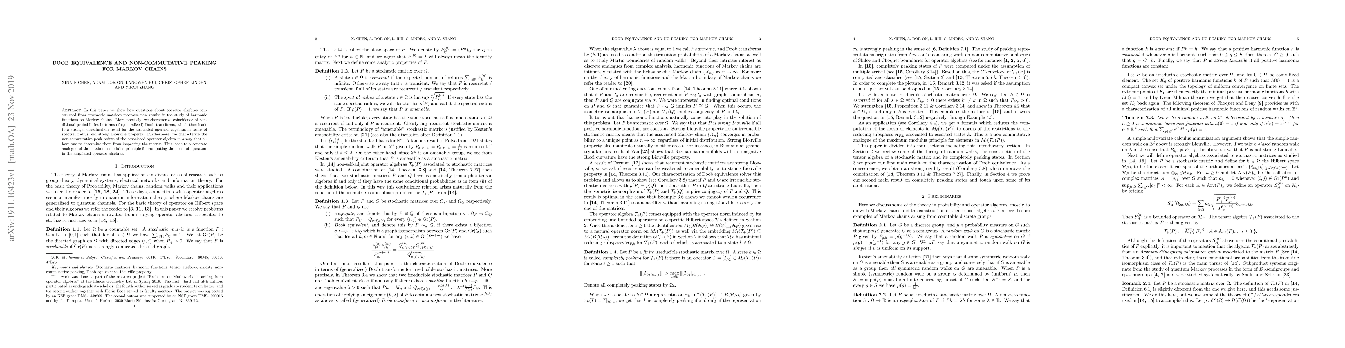 In this paper we show how questions about operator algebras constructed from stochastic matrices motivate new results in the study of harmonic functions on Markov chains. More precisely, we characterize coincidence of conditional probabilities in terms of (generalized) Doob transforms, which then leads to a stronger classification result for the associated operator algebras in terms of spectral radius and strong Liouville property. Furthermore, we characterize the non-commutative peak points of the associated operator algebra in a way that allows one to determine them from inspecting the matrix. This leads to a concrete analogue of the maximum modulus principle for computing the norm of operators in the ampliated operator algebras.