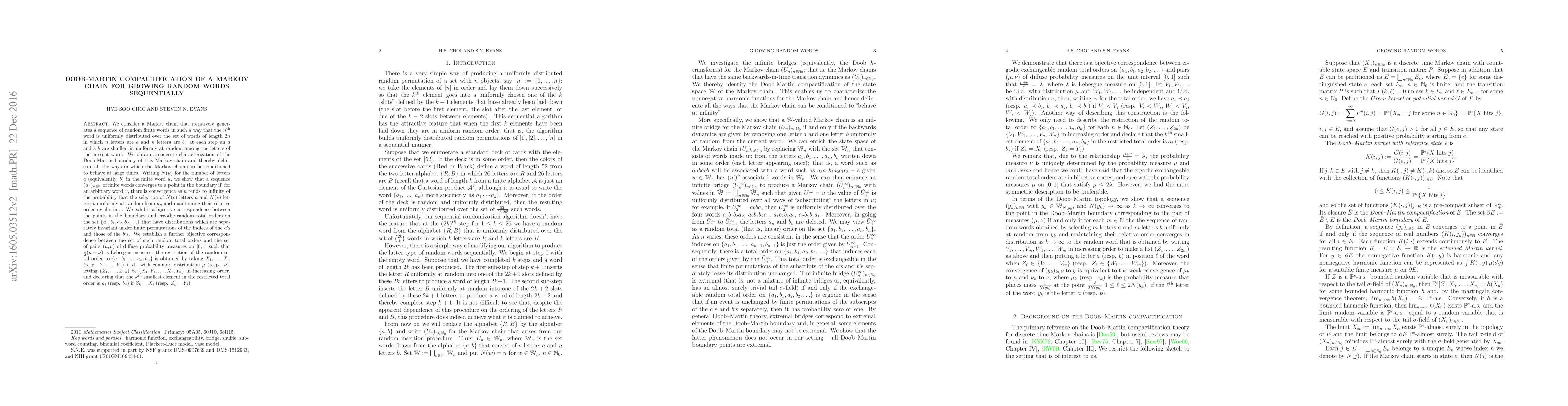 We consider a Markov chain that iteratively generates a sequence of random finite words in such a way that the $n^{\mathrm{th}}$ word is uniformly distributed over the set of words of length $2n$ in which $n$ letters are $a$ and $n$ letters are $b$: at each step an $a$ and a $b$ are shuffled in uniformly at random among the letters of the current word. We obtain a concrete characterization of the Doob-Martin boundary of this Markov chain. Writing $N(u)$ for the number of letters $a$ (equivalently, $b$) in the finite word $u$, we show that a sequence $(u_n)_{n \in \mathbb{N}}$ of finite words converges to a point in the boundary if, for an arbitrary word $v$, there is convergence as $n$ tends to infinity of the probability that the selection of $N(v)$ letters $a$ and $N(v)$ letters $b$ uniformly at random from $u_n$ and maintaining their relative order results in $v$. We exhibit a bijective correspondence between the points in the boundary and ergodic random total orders on the set $\{a_1, b_1, a_2, b_2, \ldots \}$ that have distributions which are separately invariant under finite permutations of the indices of the $a'$s and those of the $b'$s. We establish a further bijective correspondence between the set of such random total orders and the set of pairs $(\mu,\nu)$ of diffuse probability measures on $[0,1]$ such that $\frac{1}{2}(\mu+\nu)$ is Lebesgue measure: the restriction of the random total order to $\{a_1, b_1, \ldots, a_n, b_n\}$ is obtained by taking $X_1, \ldots, X_n$ (resp. $Y_1, \ldots, Y_n$) i.i.d. with common distribution $\mu$ (resp. $\nu$), letting $(Z_1, \ldots, Z_{2n})$ be $\{X_1, Y_1, \ldots, X_n, Y_n\}$ in increasing order, and declaring that the $k^{\mathrm{th}}$ smallest element in the restricted total order is $a_i$ (resp. $b_j$) if $Z_k = X_i$ (resp. $Z_k = Y_j$).