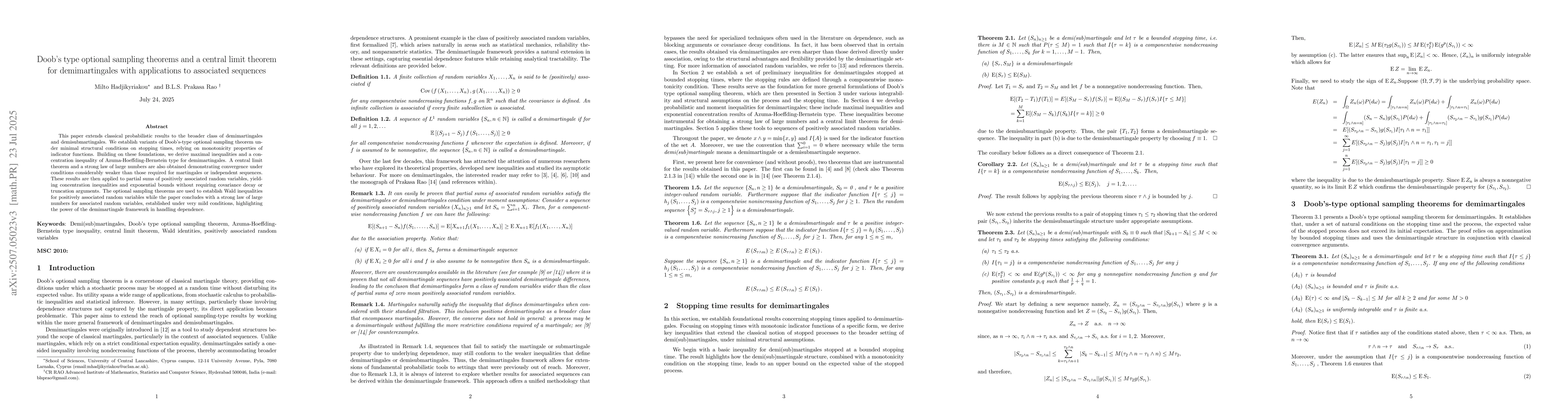 This paper extends classical probabilistic results to the broader class of demimartingales and demisubmartingales. We establish variants of Doob's-type optional sampling theorem under minimal structural conditions on stopping times, relying on monotonicity properties of indicator functions. Building on these foundations, we derive maximal inequalities, moment bounds, and a concentration inequality of Azuma- Hoeffding type for demimartingales with bounded increments. A central limit theorem and a strong law of large numbers are also obtained for demimartingales, demonstrating convergence under conditions considerably weaker than those required for martingales or independent sequences. These results are then applied to partial sums of positively associated random variables, yielding expectation bounds, concentration inequalities, and exponential bounds without requiring covariance decay or truncation arguments. The paper concludes with a strong law of large numbers for associated random variables, established under very mild conditions, highlighting the power of the demimartingale framework in handling dependence.
