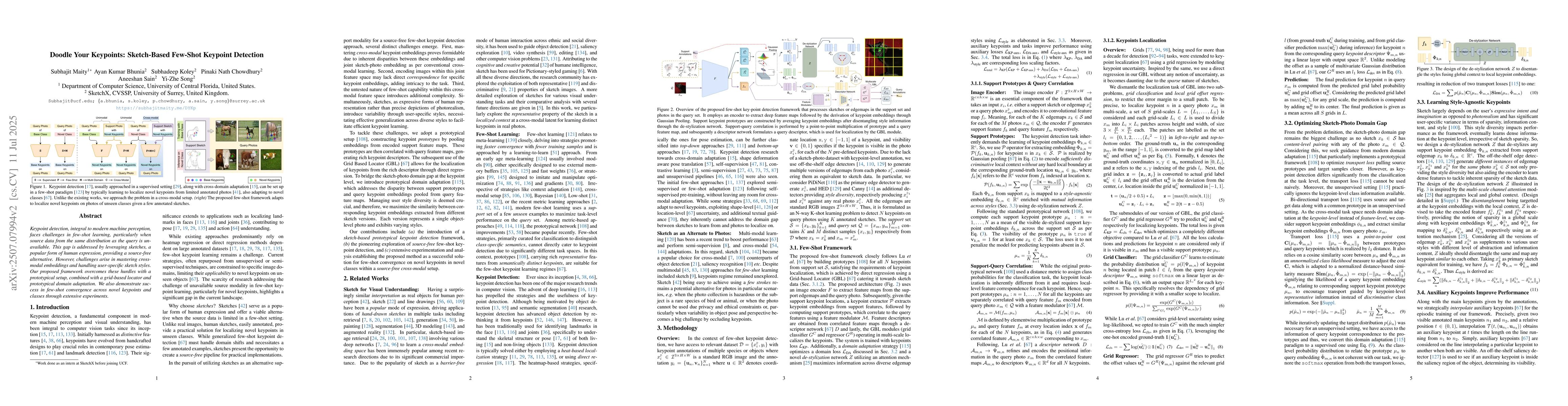 Keypoint detection, integral to modern machine perception, faces challenges in few-shot learning, particularly when source data from the same distribution as the query is unavailable. This gap is addressed by leveraging sketches, a popular form of human expression, providing a source-free alternative. However, challenges arise in mastering cross-modal embeddings and handling user-specific sketch styles. Our proposed framework overcomes these hurdles with a prototypical setup, combined with a grid-based locator and prototypical domain adaptation. We also demonstrate success in few-shot convergence across novel keypoints and classes through extensive experiments.