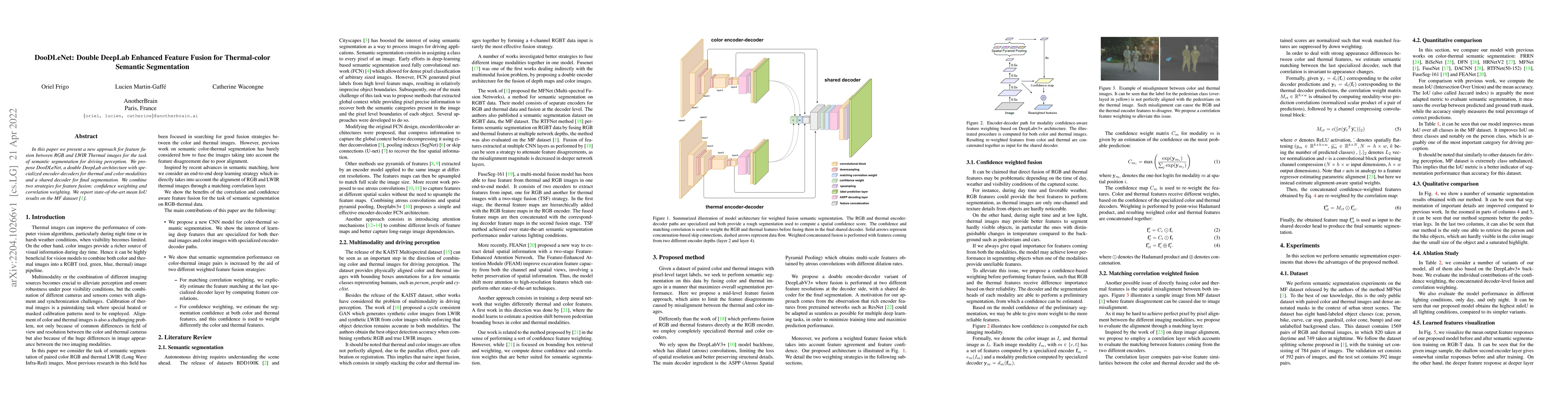 In this paper we present a new approach for feature fusion between RGB and LWIR Thermal images for the task of semantic segmentation for driving perception. We propose DooDLeNet, a double DeepLab architecture with specialized encoder-decoders for thermal and color modalities and a shared decoder for final segmentation. We combine two strategies for feature fusion: confidence weighting and correlation weighting. We report state-of-the-art mean IoU results on the MF dataset.