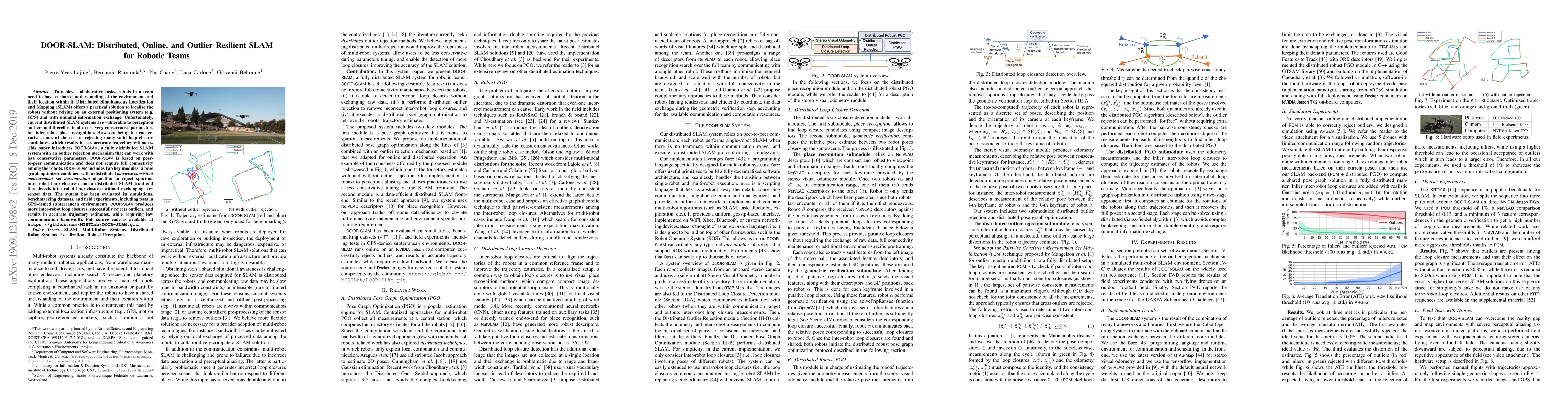DOOR-SLAM is a distributed, online SLAM system designed for robotic teams that effectively rejects outliers to improve loop closure detection and trajectory accuracy. It employs a pose graph optimizer and a distributed front-end to minimize communication while maximizing valid loop closures.