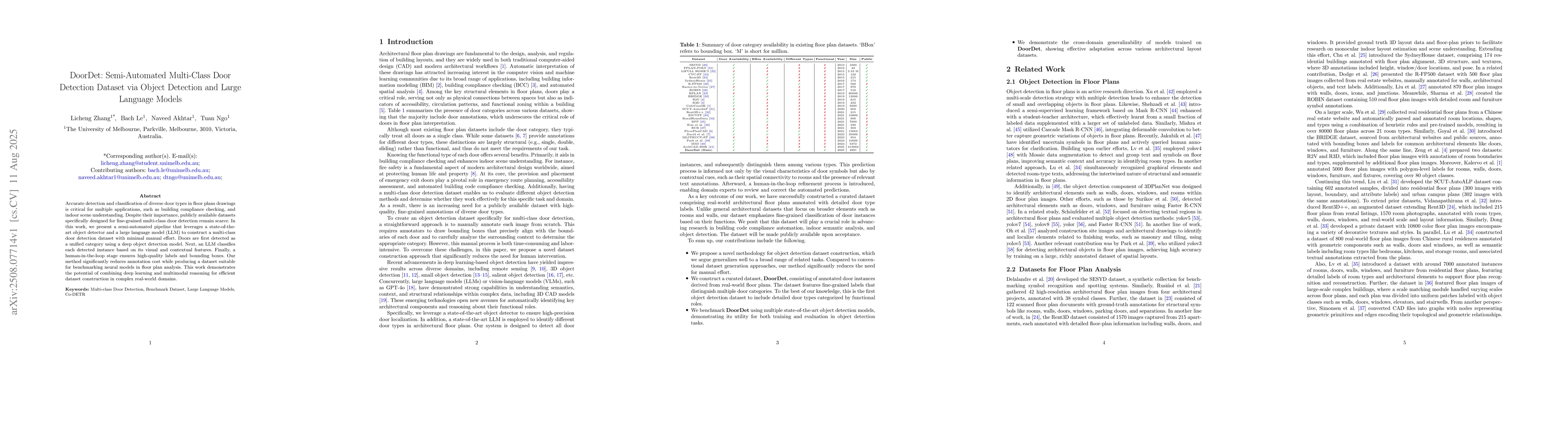 Accurate detection and classification of diverse door types in floor plans drawings is critical for multiple applications, such as building compliance checking, and indoor scene understanding. Despite their importance, publicly available datasets specifically designed for fine-grained multi-class door detection remain scarce. In this work, we present a semi-automated pipeline that leverages a state-of-the-art object detector and a large language model (LLM) to construct a multi-class door detection dataset with minimal manual effort. Doors are first detected as a unified category using a deep object detection model. Next, an LLM classifies each detected instance based on its visual and contextual features. Finally, a human-in-the-loop stage ensures high-quality labels and bounding boxes. Our method significantly reduces annotation cost while producing a dataset suitable for benchmarking neural models in floor plan analysis. This work demonstrates the potential of combining deep learning and multimodal reasoning for efficient dataset construction in complex real-world domains.