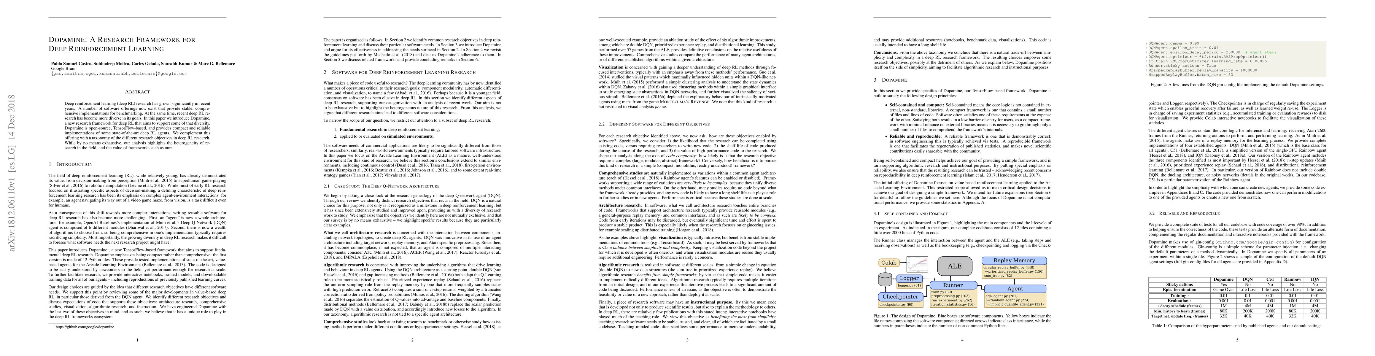 Dopamine is an open-source TensorFlow-based framework for deep reinforcement learning, designed to support diverse research objectives and provide reliable implementations of state-of-the-art agents. The paper also presents a taxonomy to highlight the heterogeneity in deep RL research.