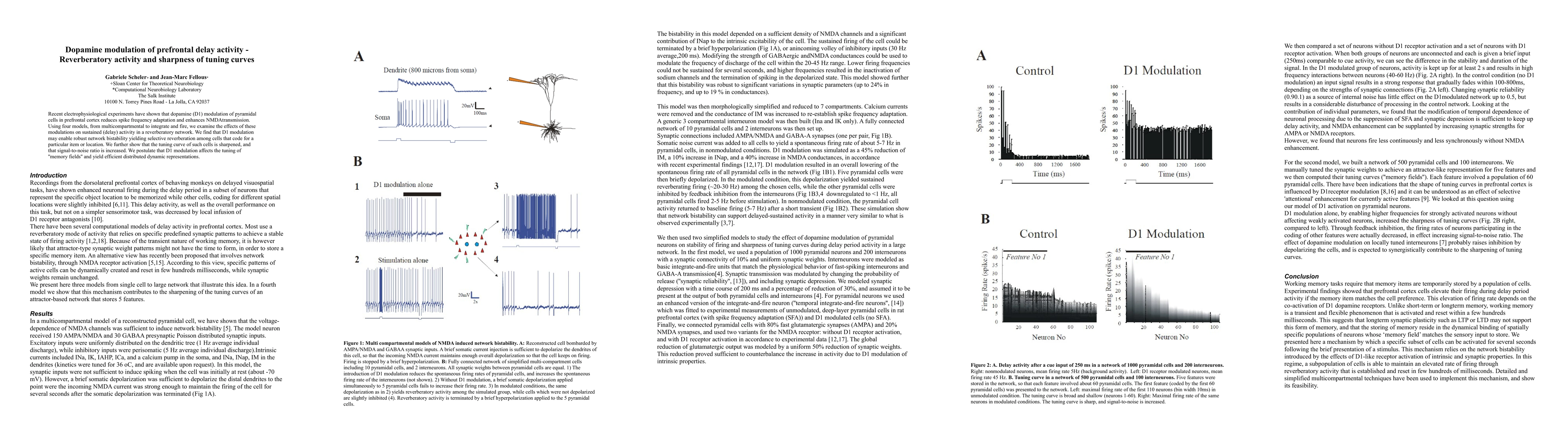 Recent electrophysiological experiments have shown that dopamine (D1) modulation of pyramidal cells in prefrontal cortex reduces spike frequency adaptation and enhances NMDA transmission. Using four models, from multicompartmental to integrate and fire, we examine the effects of these modulations on sustained (delay) activity in a reverberatory network. We find that D1 modulation may enable robust network bistability yielding selective reverberation among cells that code for a particular item or location. We further show that the tuning curve of such cells is sharpened, and that signal-to-noise ratio is increased. We postulate that D1 modulation affects the tuning of "memory fields" and yield efficient distributed dynamic representations.