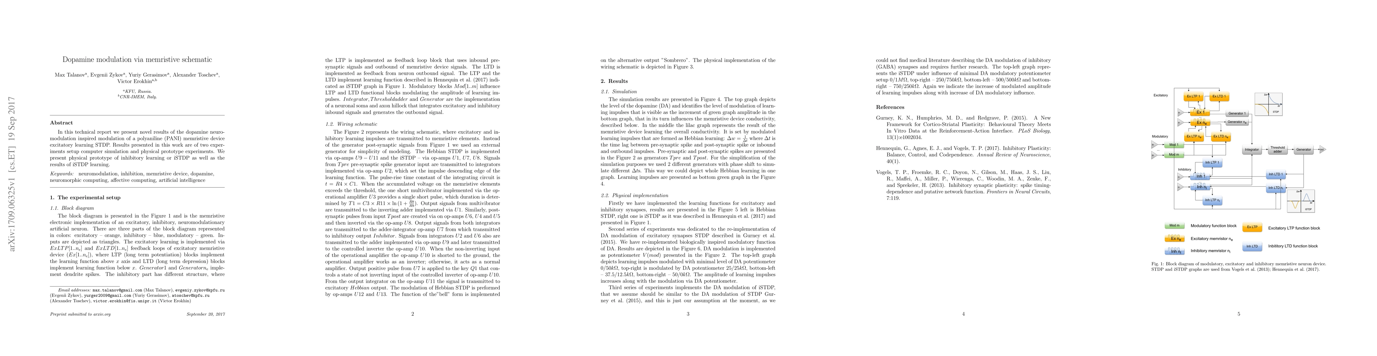 In this technical report we present novel results of the dopamine neuromodulation inspired modulation of a polyaniline (PANI) memristive device excitatory learning STDP. Results presented in this work are of two experiments setup computer simulation and physical prototype experiments. We present physical prototype of inhibitory learning or iSTDP as well as the results of iSTDP learning.