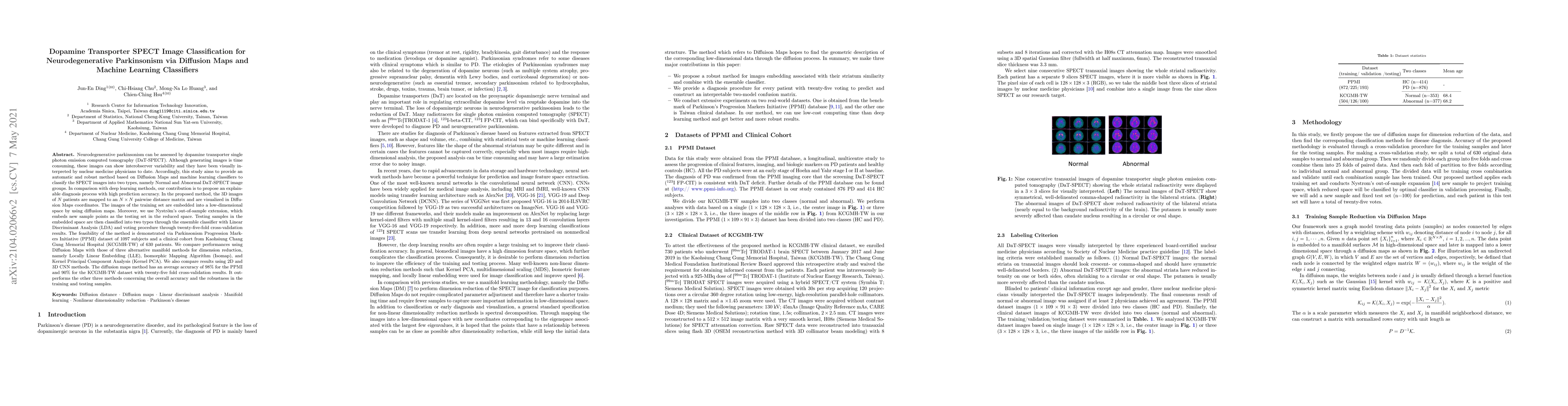 This study proposes an automated method using Diffusion Maps and machine learning classifiers to classify dopamine transporter SPECT images for diagnosing neurodegenerative parkinsonism. The method achieves high accuracy, outperforming alternative dimension reduction techniques and demonstrating robust performance across two datasets.