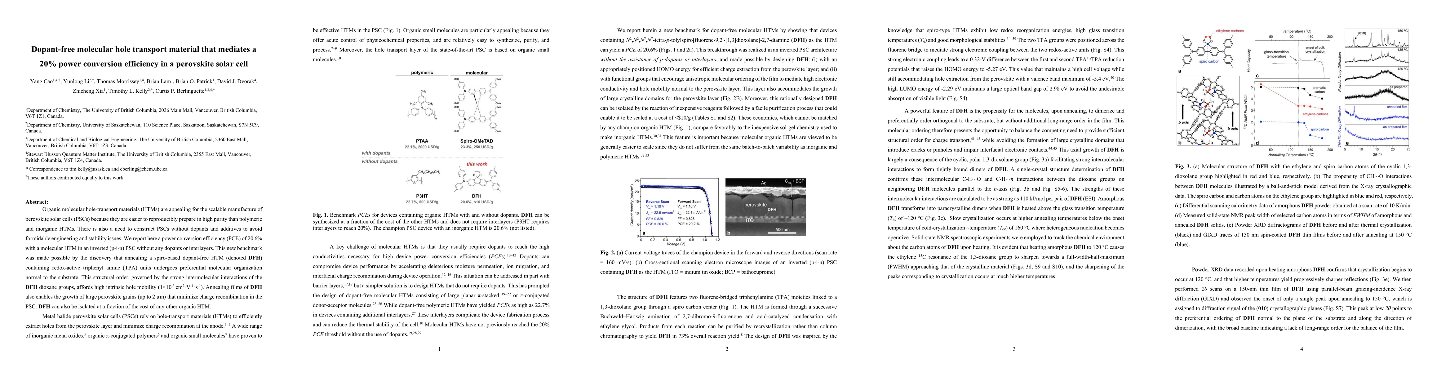 This paper presents a dopant-free molecular hole transport material (DFH) achieving a 20.6% power conversion efficiency in an inverted perovskite solar cell, achieved through annealing-induced molecular organization and large perovskite grain growth. DFH's cost-effectiveness and high intrinsic hole mobility further enhance its scalability.