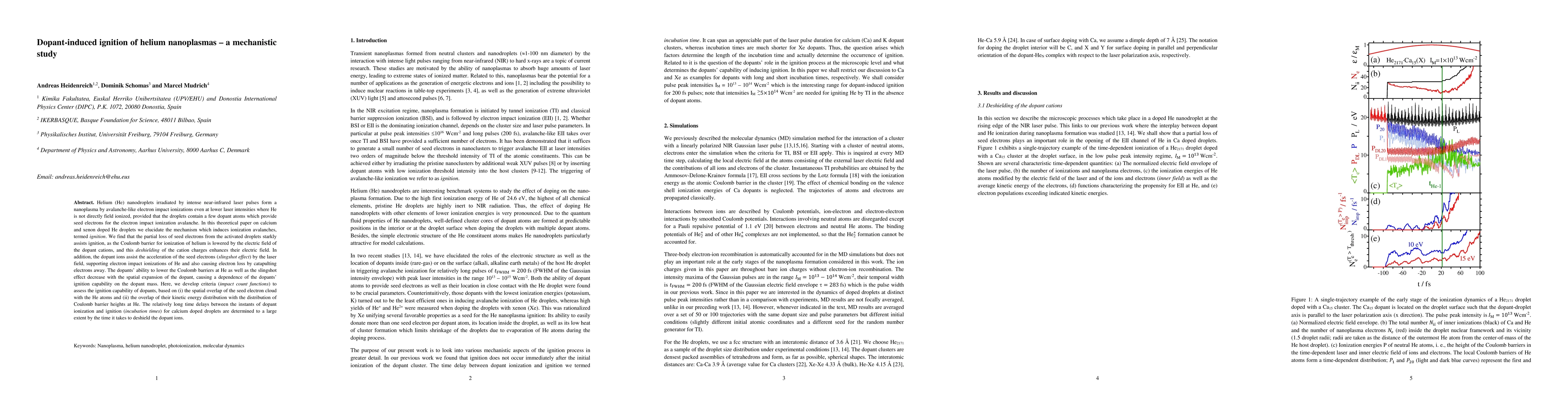 Helium (He) nanodroplets irradiated by intense near-infrared laser pulses form a nanoplasma by avalanche-like electron impact ionizations even at lower laser intensities where He is not directly field ionized, provided that the droplets contain a few dopant atoms which provide seed electrons for the electron impact ionization avalanche. In this theoretical paper on calcium and xenon doped He droplets we elucidate the mechanism which induces ionization avalanches, termed ignition. We find that the partial loss of seed electrons from the activated droplets starkly assists ignition, as the Coulomb barrier for ionization of helium is lowered by the electric field of the dopant cations, and this deshielding of the cation charges enhances their electric field. In addition, the dopant ions assist the acceleration of the seed electrons (slingshot effect) by the laser field, supporting electron impact ionizations of He and also causing electron loss by catapulting electrons away. The dopants' ability to lower the Coulomb barriers at He as well as the slingshot effect decrease with the spatial expansion of the dopant, causing a dependence of the dopants' ignition capability on the dopant mass. Here, we develop criteria (impact count functions) to assess the ignition capability of dopants, based on (i) the spatial overlap of the seed electron cloud with the He atoms and (ii) the overlap of their kinetic energy distribution with the distribution of Coulomb barrier heights at He. The relatively long time delays between the instants of dopant ionization and ignition (incubation times) for calcium doped droplets are determined to a large extent by the time it takes to deshield the dopant ions.