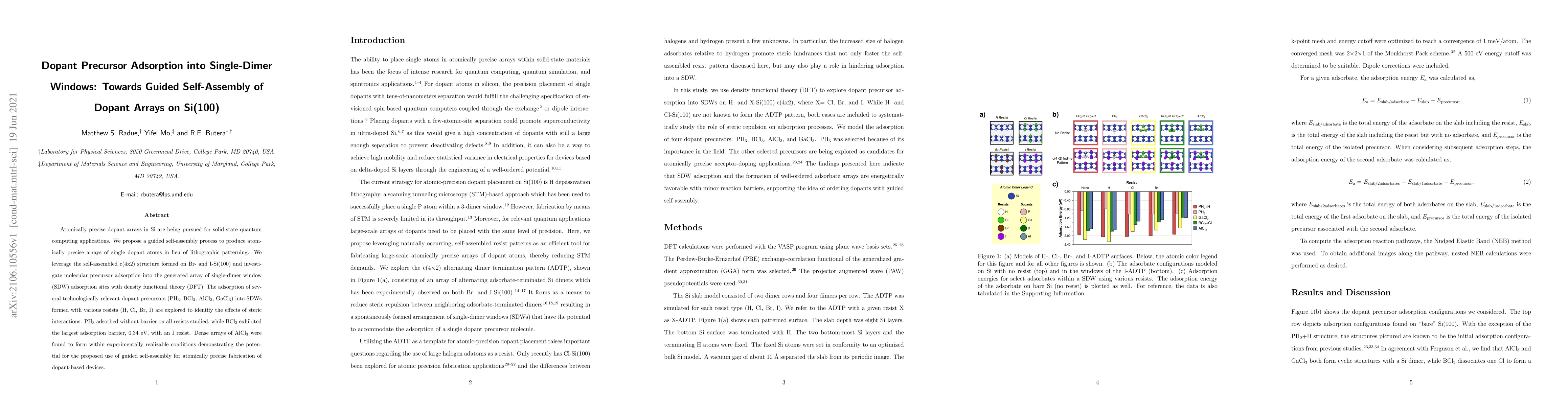This research explores a guided self-assembly method to create atomically precise arrays of dopant atoms on Si(100) for quantum computing, focusing on adsorption of dopant precursors into single-dimer windows formed in a c(4x2) structure. Density functional theory reveals that PH$_3$ adsorbs easily, while BCl$_3$ has the highest barrier, and AlCl$_3$ forms dense arrays under practical conditions, indicating potential for precise fabrication.