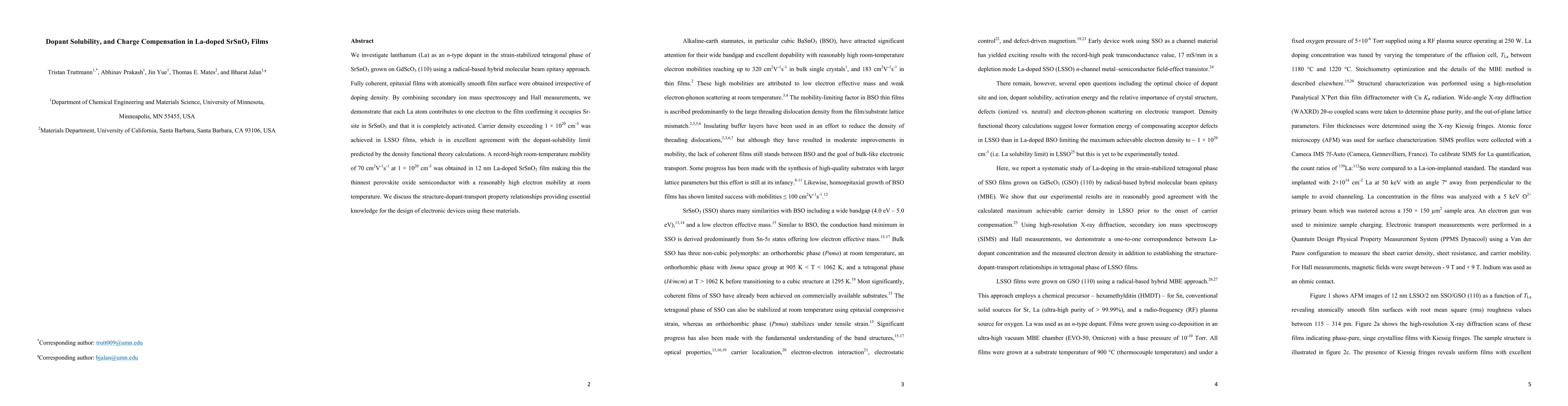 This study investigates lanthanum doping in SrSnO3 films grown via a hybrid molecular beam epitaxy approach, achieving high carrier density and electron mobility. The research confirms complete activation of La dopants, contributing one electron each, and demonstrates a record-high room-temperature mobility in thin perovskite oxide semiconductors.