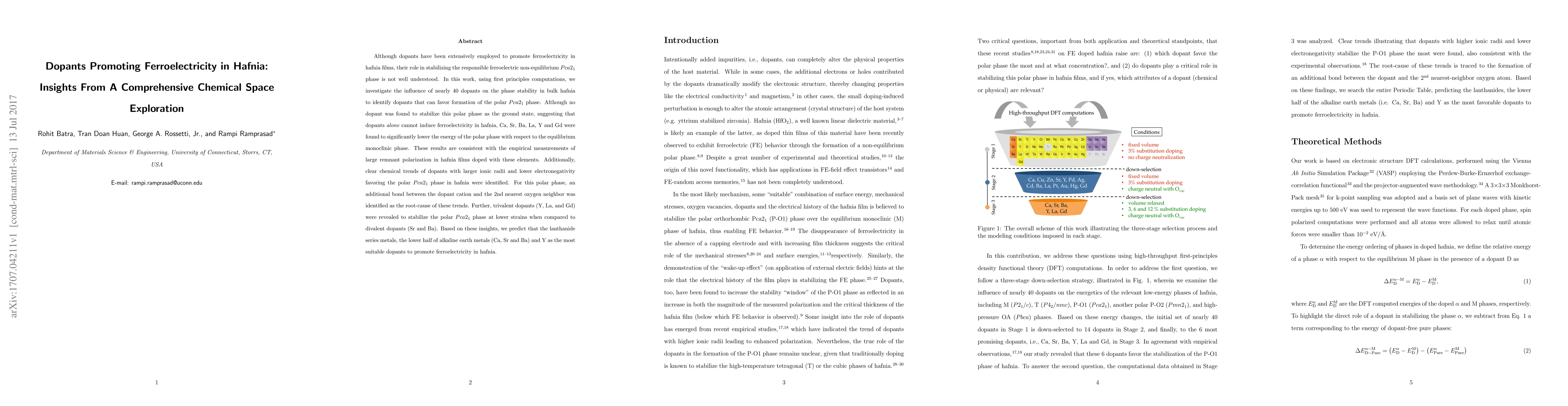This study uses first-principles computations to explore the effects of nearly 40 dopants on phase stability in hafnia, identifying Ca, Sr, Ba, La, Y, and Gd as those that significantly lower the energy of the polar Pca21 phase, thus promoting ferroelectricity despite the phase not being stabilized as the ground state.