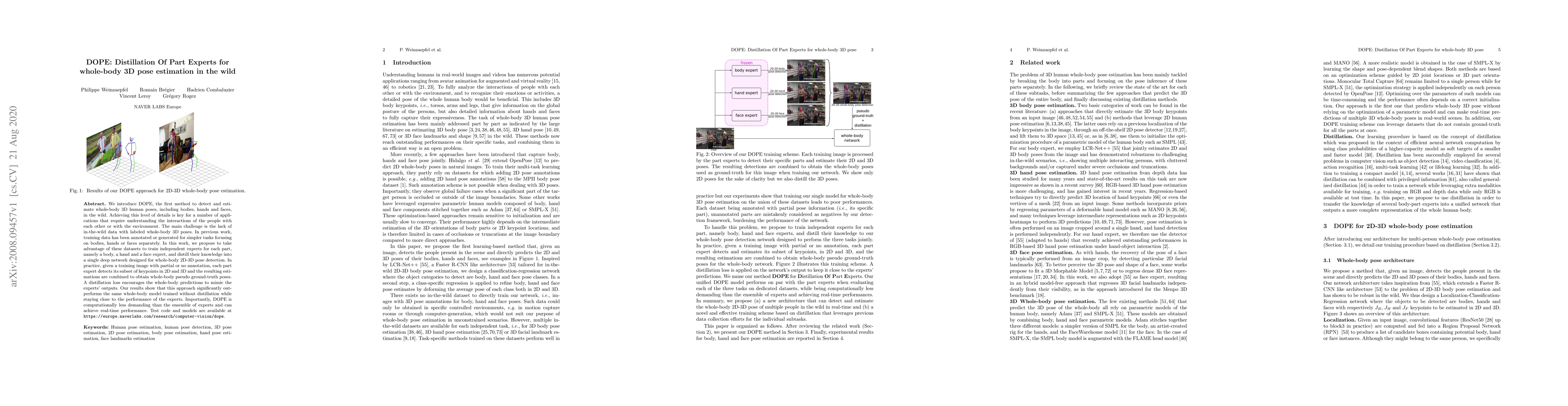 DOPE introduces a method for detecting and estimating detailed whole-body 3D human poses in natural settings by distilling knowledge from independent experts for bodies, hands, and faces. This approach outperforms whole-body models trained without distillation and achieves real-time performance.