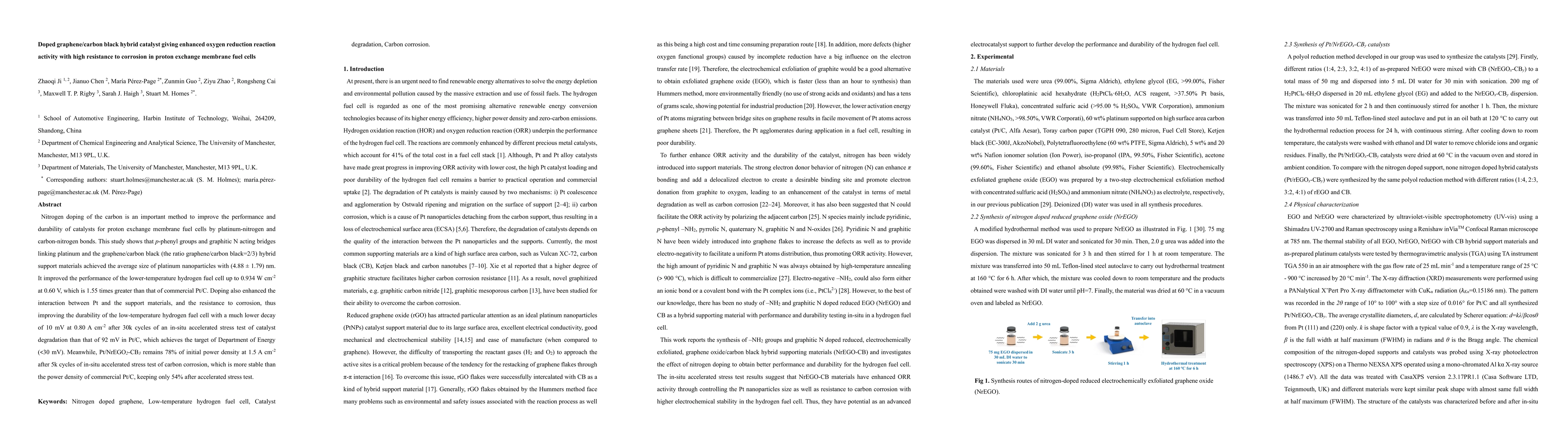 This study presents a nitrogen-doped graphene/carbon black hybrid catalyst that significantly enhances oxygen reduction reaction activity in proton exchange membrane fuel cells, achieving a power density of 0.934 W cm-2 at 0.60 V, which is 1.55 times greater than commercial Pt/C. The catalyst also shows superior corrosion resistance and durability, maintaining 78% of its initial power density after 5k cycles.