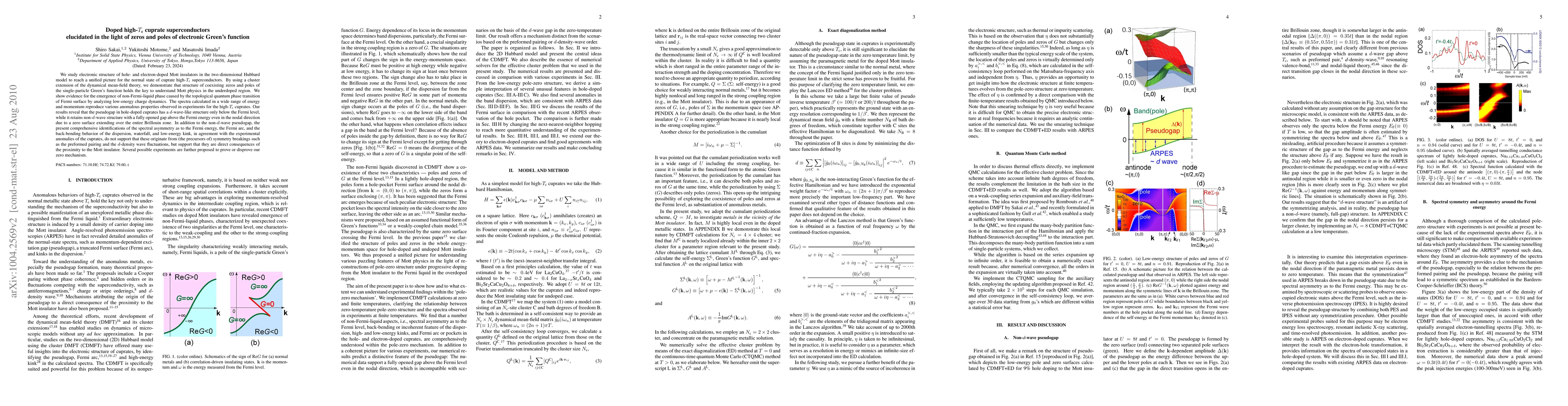 This paper uses a cluster extension of dynamical mean-field theory to study the electronic structure of doped Mott insulators in the two-dimensional Hubbard model, revealing that the zeros and poles of the single-particle Green's function are crucial for understanding the normal state of high-Tc cuprate superconductors. The study finds evidence for a non-Fermi-liquid phase and a pseudogap with a non-d-wave structure above the Fermi level, challenging conventional pairing theories.