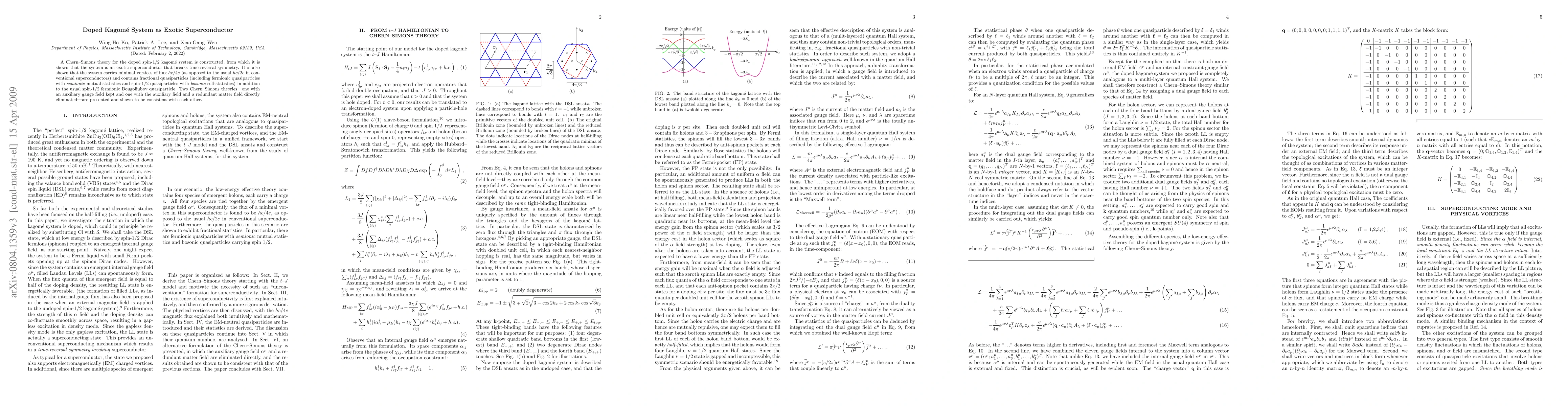 A Chern--Simons theory for the doped spin-1/2 kagom\'e system is constructed, from which it is shown that the system is an exotic superconductor that breaks time-reversal symmetry. It is also shown that the system carries minimal vortices of flux $hc/4e$ (as opposed to the usual $hc/2e$ in conventional superconductors) and contains fractional quasiparticles (including fermionic quasiparticles with \emph{semionic} mutual statistics and spin-1/2 quasiparticles with \emph{bosonic} self-statistics) in addition to the usual spin-1/2 fermionic Bougoliubov quasiparticle. Two Chern--Simons theories--one with an auxiliary gauge field kept and one with the auxiliary field and a redundant matter field directly eliminated--are presented and shown to be consistent with each other.