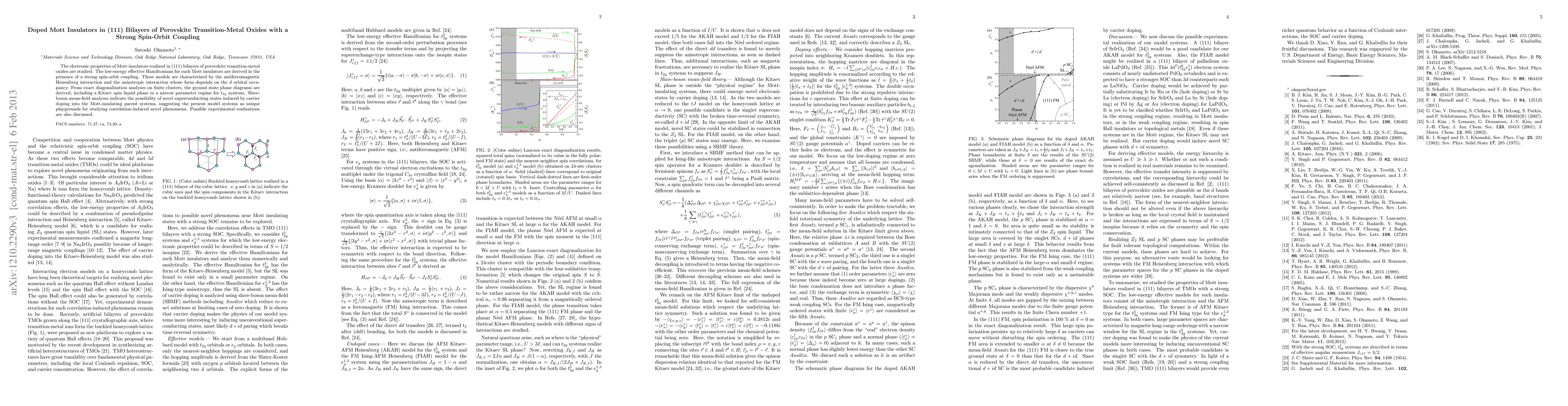 This paper investigates the electronic properties of Mott insulators in (111) bilayers of perovskite transition-metal oxides under strong spin-orbit coupling, revealing a potential Kitaev spin liquid phase and novel superconducting states induced by doping, highlighting their role in exploring correlation-induced phenomena.