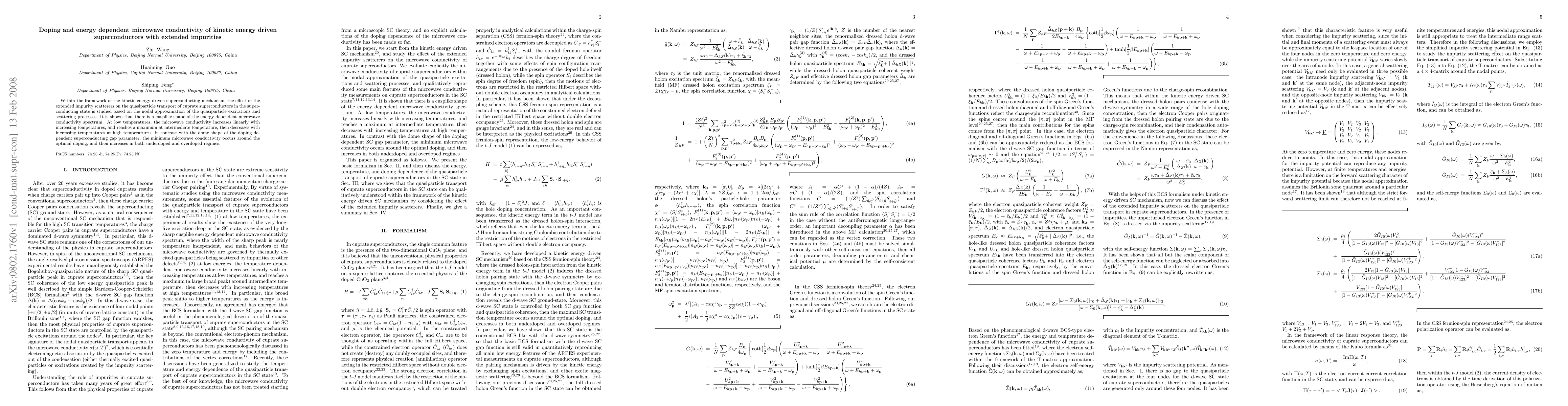 This paper investigates the impact of extended impurities on the microwave conductivity of kinetic energy driven superconductors, revealing a cusplike energy-dependent spectrum. The microwave conductivity increases linearly with temperature at low temperatures, peaks at intermediate temperatures, and declines at high temperatures, contrasting with the dome-shaped doping dependence of the superconducting gap parameter.
