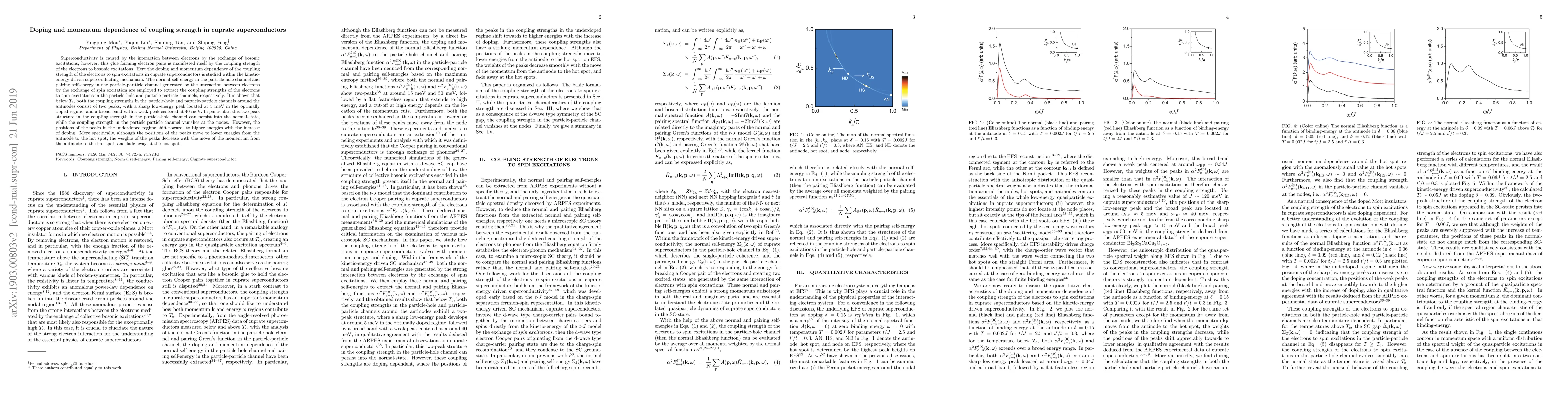 This paper investigates the doping and momentum dependence of electron coupling strength to spin excitations in cuprate superconductors, revealing a two-peak structure in the coupling strength below the transition temperature, with distinct behaviors in the particle-hole and particle-particle channels. The peaks shift towards higher energies with increased doping, and their weights diminish towards the hot spots on the Fermi surface.