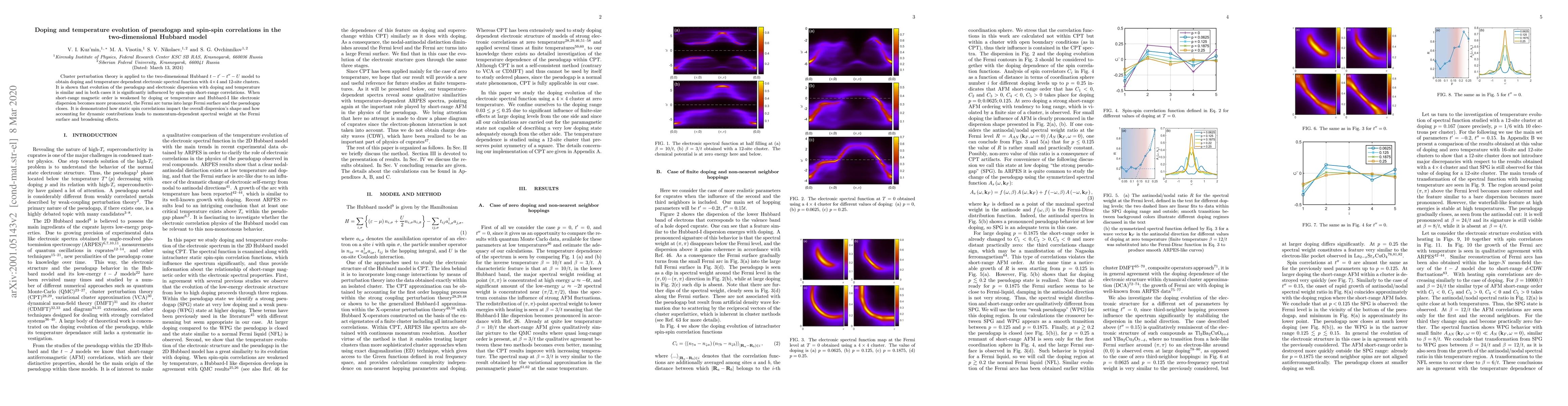 This paper uses cluster perturbation theory to study the two-dimensional Hubbard model, revealing that doping and temperature similarly influence the pseudogap and electronic dispersion through spin-spin correlations. The pseudogap closes and the Fermi arc transforms into a large Fermi surface when magnetic order weakens.