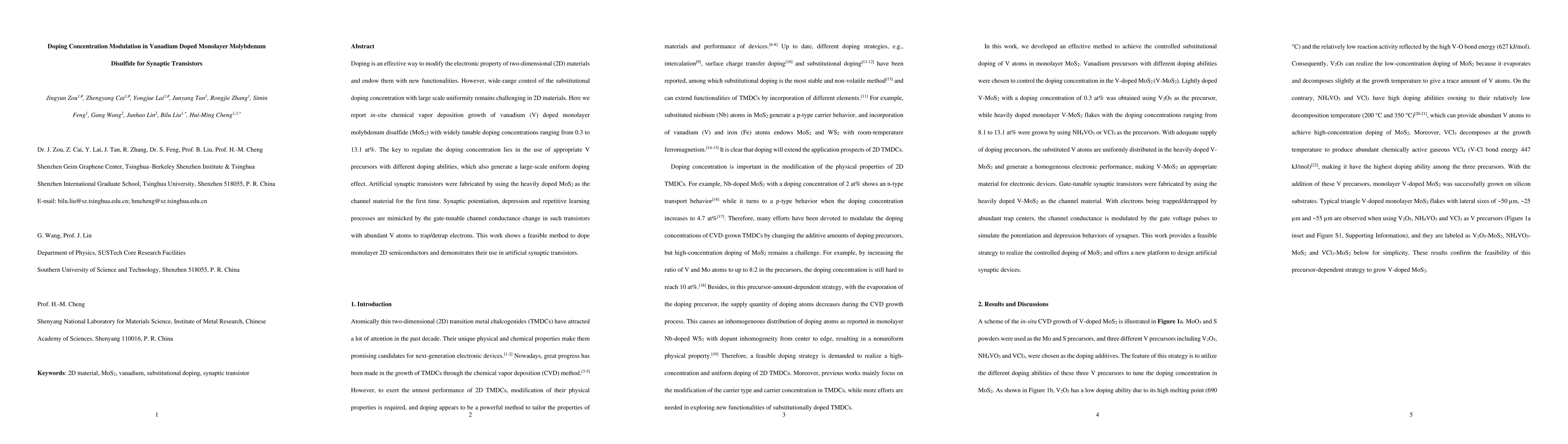 This paper reports the in-situ chemical vapor deposition of vanadium-doped monolayer molybdenum disulfide with tunable doping concentrations, achieving uniform large-scale doping. The study demonstrates the use of heavily doped MoS2 in artificial synaptic transistors, mimicking synaptic functions through gate-tunable conductance changes.
