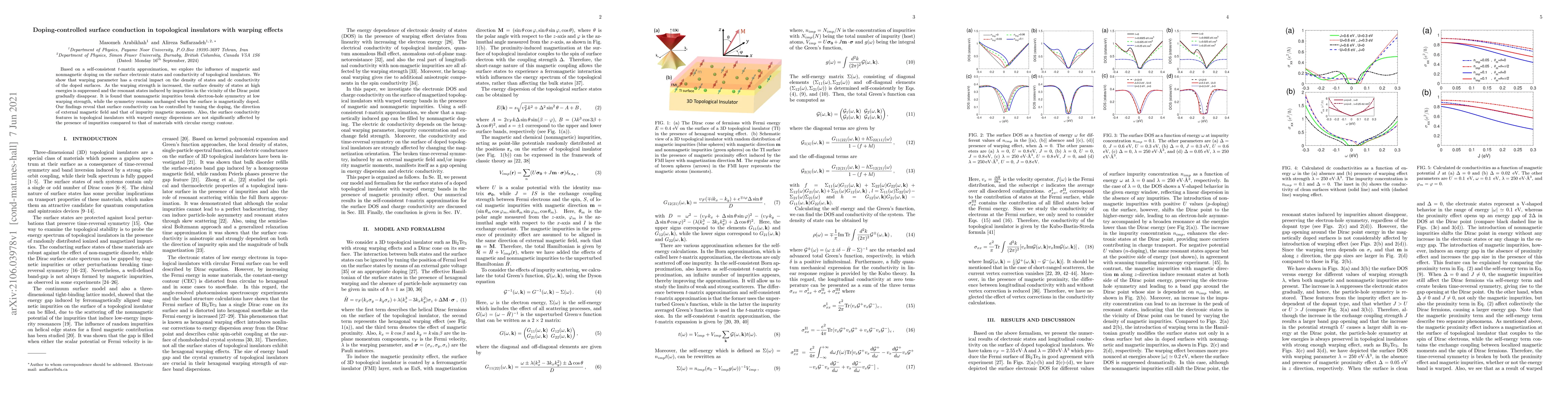 This paper investigates how doping influences the surface conduction in topological insulators, demonstrating that warping effects significantly alter the density of states and dc conductivity. The study reveals that surface conductivity can be controlled by adjusting doping type, magnetic field direction, and impurity magnetic moments, with nonmagnetic doping breaking electron-hole symmetry at low warping strength.