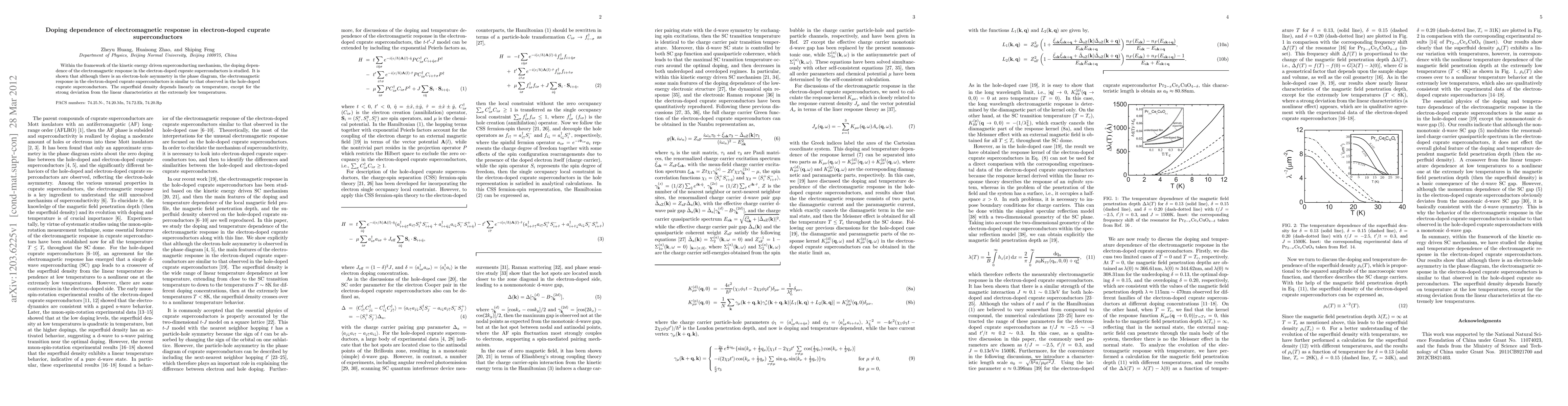 This study investigates the doping-dependent electromagnetic response in electron-doped cuprate superconductors, revealing similarities with hole-doped counterparts. The superfluid density shows a linear temperature dependence, with notable deviations at very low temperatures.