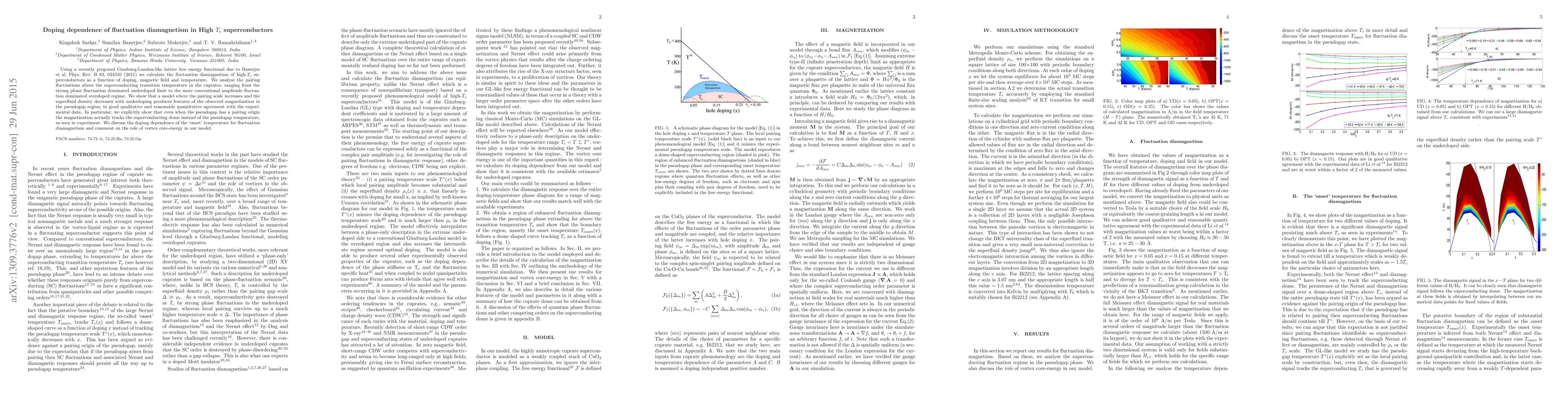 This paper investigates the doping dependence of fluctuation diamagnetism in high-Tc superconductors using a Ginzburg-Landau-like lattice free energy functional. It finds that pairing fluctuations above the transition temperature correlate with the observed magnetization, particularly showing that magnetization tracks the superconducting dome rather than the pseudogap temperature.