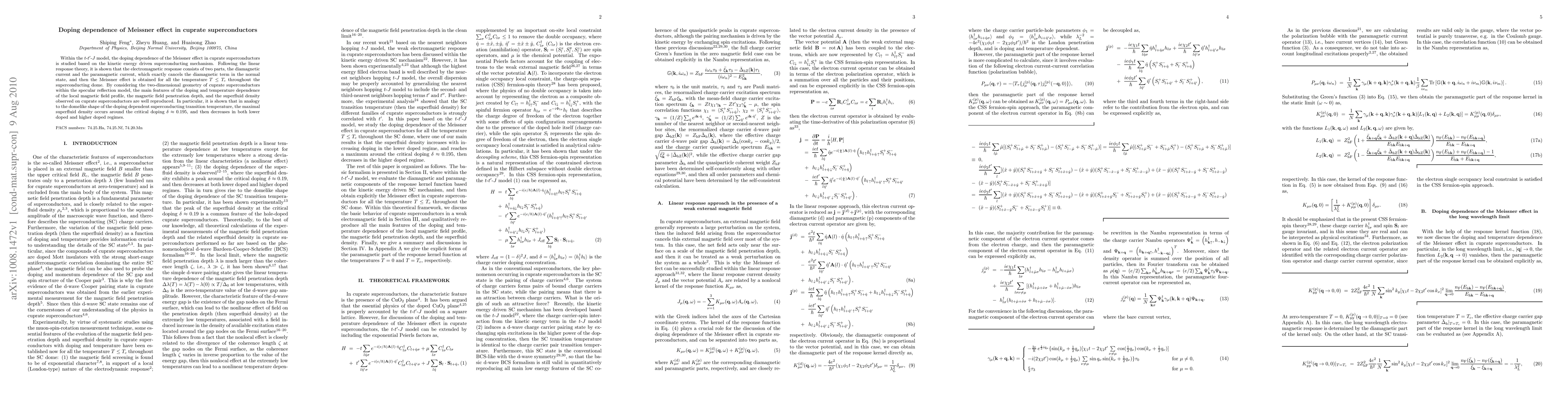 The study examines the doping dependence of the Meissner effect in cuprate superconductors using the t-t'-J model, revealing that electromagnetic response is a combination of diamagnetic and paramagnetic currents that enable the Meissner effect below the critical temperature. The maximal superfluid density is found at the critical doping level of approximately δ = 0.195, decreasing in both underdoped and overdoped states.