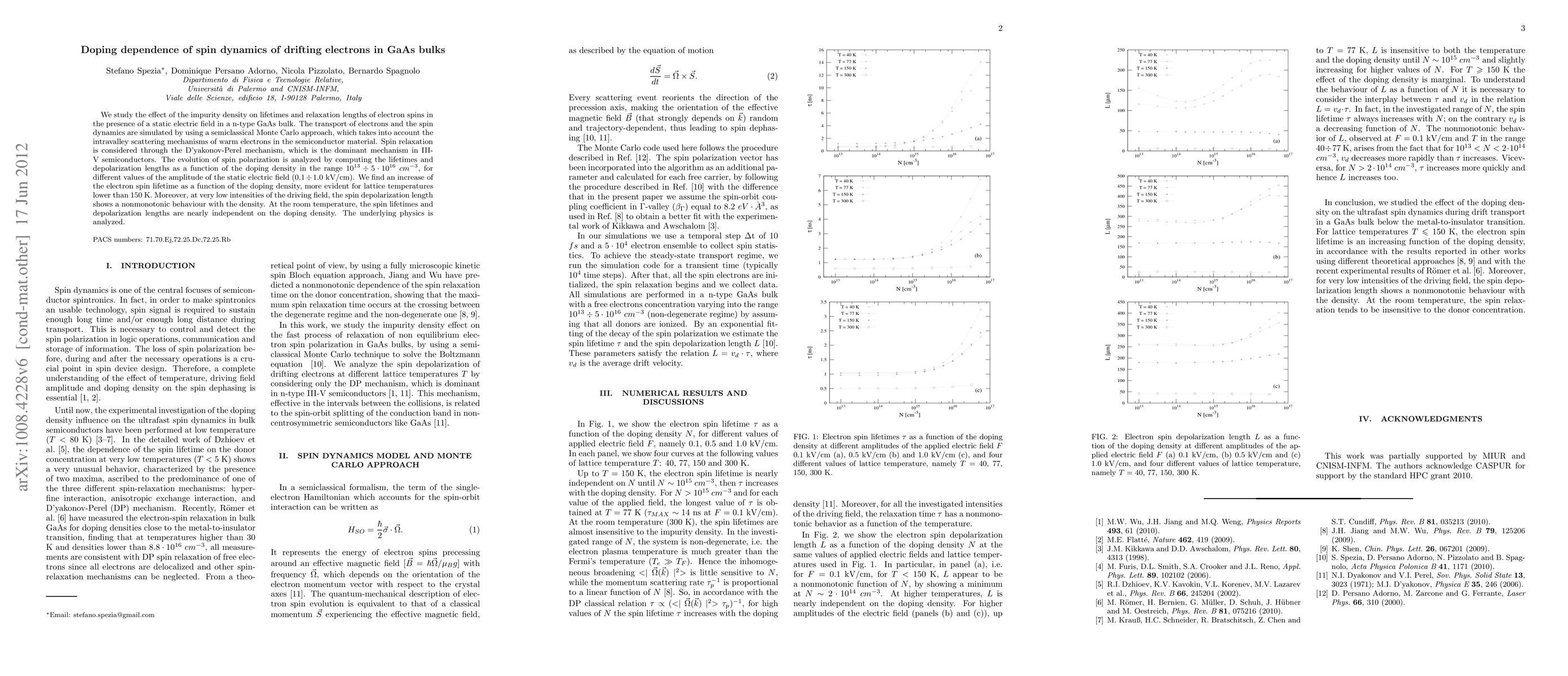 We study the effect of the impurity density on lifetimes and relaxation lengths of electron spins in the presence of a static electric field in a n-type GaAs bulk. The transport of electrons and the spin dynamics are simulated by using a semiclassical Monte Carlo approach, which takes into account the intravalley scattering mechanisms of warm electrons in the semiconductor material. Spin relaxation is considered through the D'yakonov-Perel mechanism, which is the dominant mechanism in III-V semiconductors. The evolution of spin polarization is analyzed by computing the lifetimes and depolarization lengths as a function of the doping density in the range 10^{13} - 10^{16} cm^{-3}, for different values of the amplitude of the static electric field (0.1 - 1.0 kV/cm). We find an increase of the electron spin lifetime as a function of the doping density, more evident for lattice temperatures lower than 150 K. Moreover, at very low intensities of the driving field, the spin depolarization length shows a nonmonotonic behaviour with the density. At the room temperature, the spin lifetimes and depolarization lengths are nearly independent on the doping density. The underlying physics is analyzed.