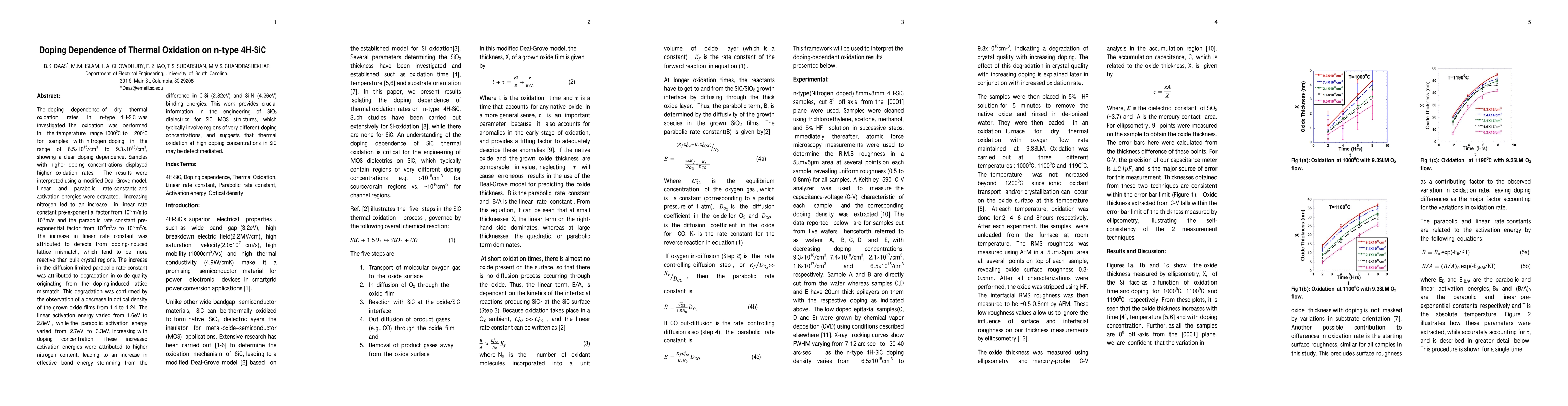 This paper investigates how nitrogen doping affects the thermal oxidation rates of n-type 4H-SiC. Higher doping concentrations were found to increase oxidation rates, with linear and parabolic rate constants and activation energies also rising, indicating that lattice mismatch and degradation in oxide quality influence oxidation processes.