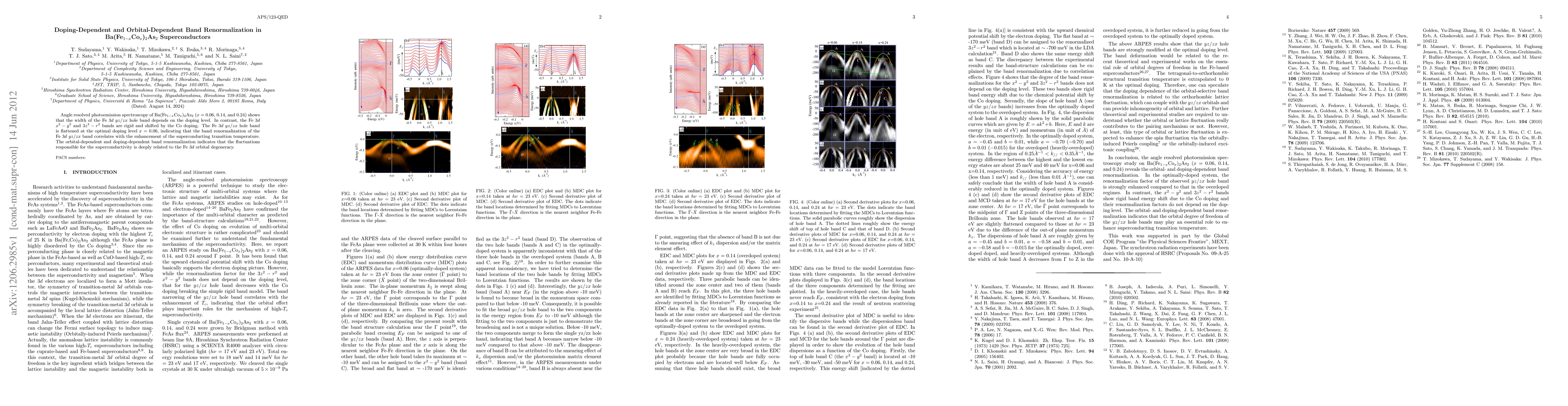 Angle resolved photoemission spectroscopy of Ba(Fe1-xCox)2As2 (x = 0.06, 0.14, and 0.24) shows that the width of the Fe 3d yz/zx hole band depends on the doping level. In contrast, the Fe 3d x^2-y^2 and 3z^2-r^2 bands are rigid and shifted by the Co doping. The Fe 3d yz/zx hole band is flattened at the optimal doping level x = 0.06, indicating that the band renormalization of the Fe 3d yz/zx band correlates with the enhancement of the superconducting transition temperature. The orbital-dependent and doping-dependent band renormalization indicates that the fluctuations responsible for the superconductivity is deeply related to the Fe 3d orbital degeneracy.