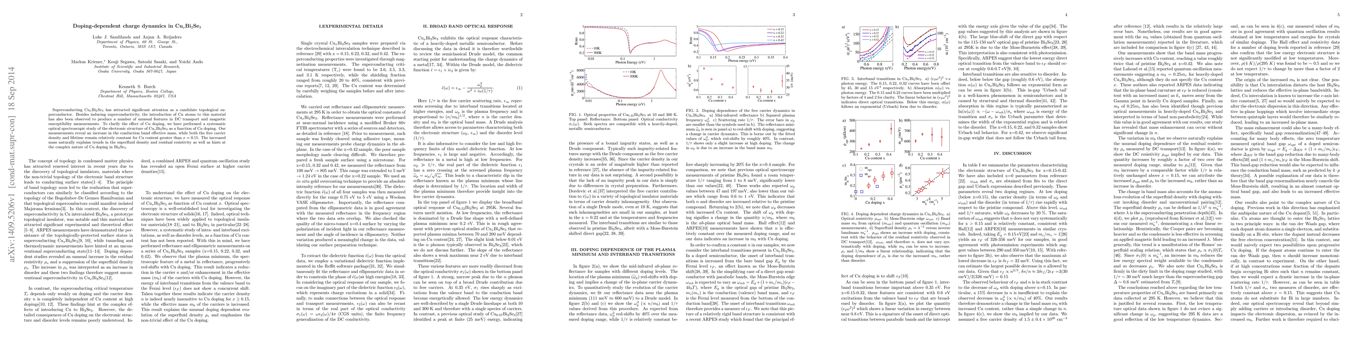 This study investigates the doping-dependent charge dynamics in CuxBi2Se3, revealing an increase in conduction band effective mass with Cu doping, while free carrier density and lifetime remain stable for Cu content above x=0.15, which correlates with observed trends in superfluid density and residual resistivity.