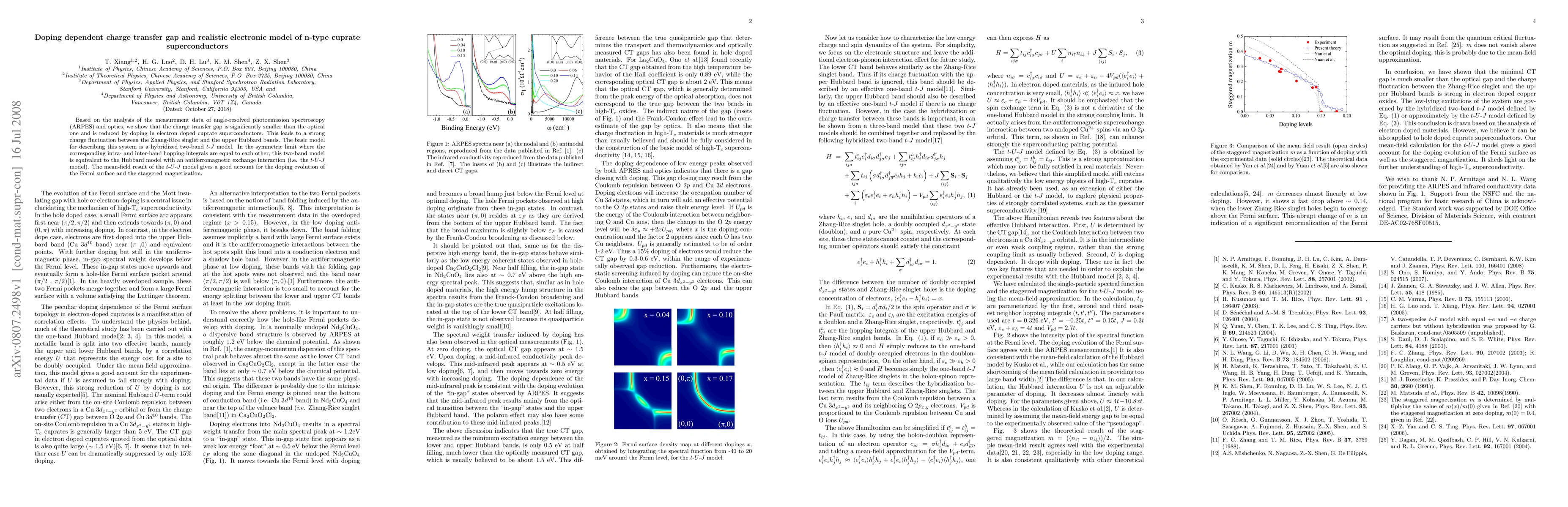 Based on the analysis of the measurement data of angle-resolved photoemission spectroscopy (ARPES) and optics, we show that the charge transfer gap is significantly smaller than the optical one and is reduced by doping in electron doped cuprate superconductors. This leads to a strong charge fluctuation between the Zhang-Rice singlet and the upper Hubbard bands. The basic model for describing this system is a hybridized two-band $t$-$J$ model. In the symmetric limit where the corresponding intra- and inter-band hopping integrals are equal to each other, this two-band model is equivalent to the Hubbard model with an antiferromagnetic exchange interaction (i.e. the $t$-$U$-$J$ model). The mean-field result of the $t$-$U$-$J$ model gives a good account for the doping evolution of the Fermi surface and the staggered magnetization.