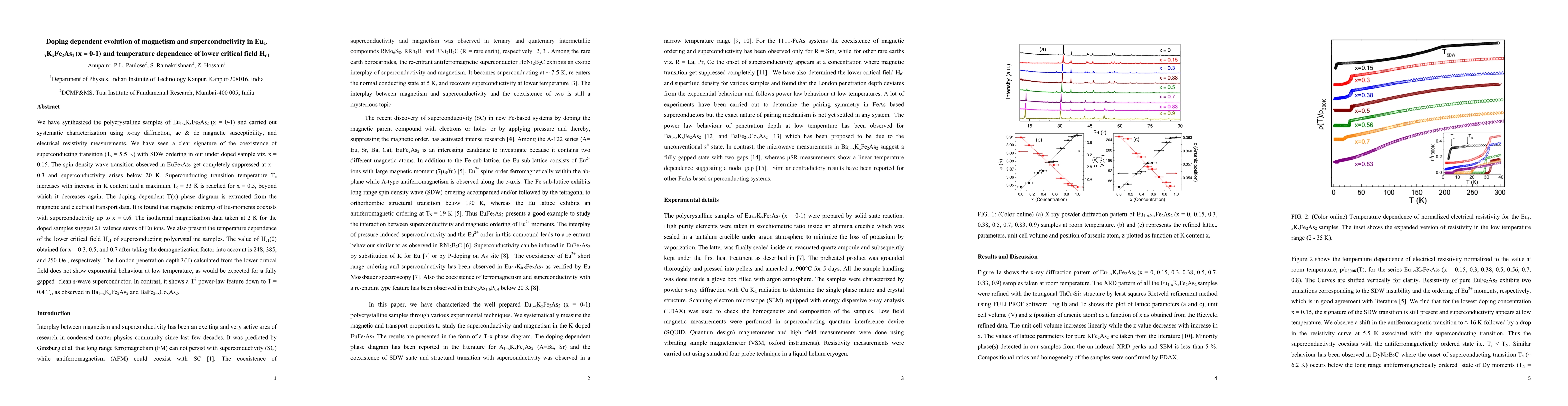 This study investigates the doping-dependent evolution of magnetism and superconductivity in Eu1-xKxFe2As2, revealing coexistence of superconductivity and spin density wave ordering in underdoped samples. The superconducting transition temperature peaks at 33 K for x = 0.5, while the lower critical field Hc1 shows a T2 power-law dependence, indicating unconventional superconductivity.