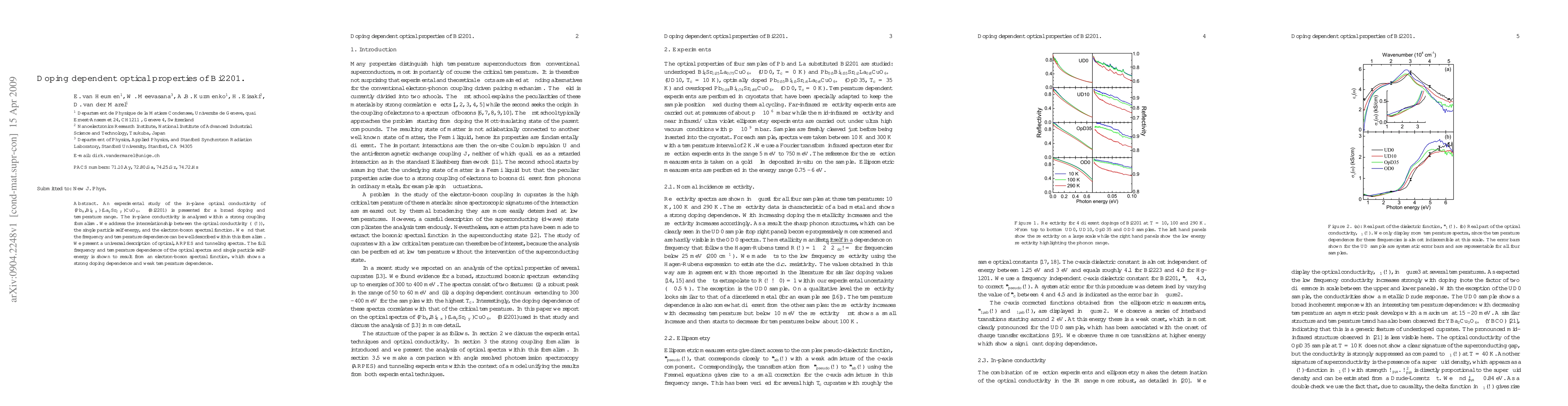 This research explores the in-plane optical conductivity of doped Bi2201 compounds over various doping levels and temperatures, demonstrating a strong coupling formalism. The study reveals a universal description of optical, ARPES, and tunneling spectra, attributing the frequency and temperature dependence to an electron-boson spectral function with significant doping effects but minimal temperature influence.
