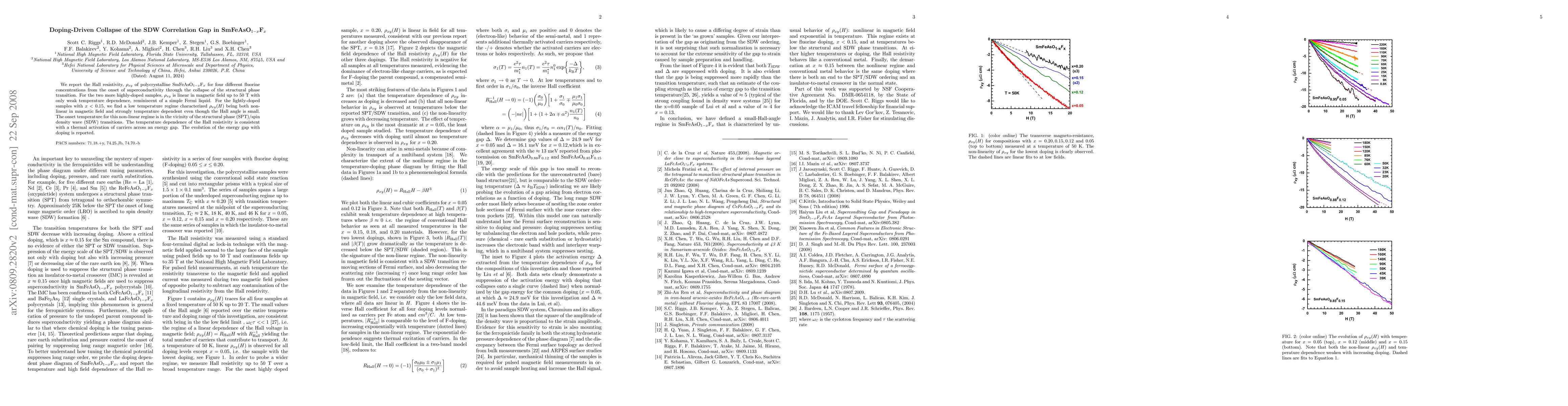 This study investigates the Hall resistivity of SmFeAsO$_{1-x}$F$_{x}$ across varying fluorine doping levels, revealing a collapse of the spin density wave correlation gap with increased doping. Highly-doped samples exhibit Fermi liquid behavior, while lightly-doped samples show non-linear Hall resistivity indicative of a thermal activation process across an energy gap.