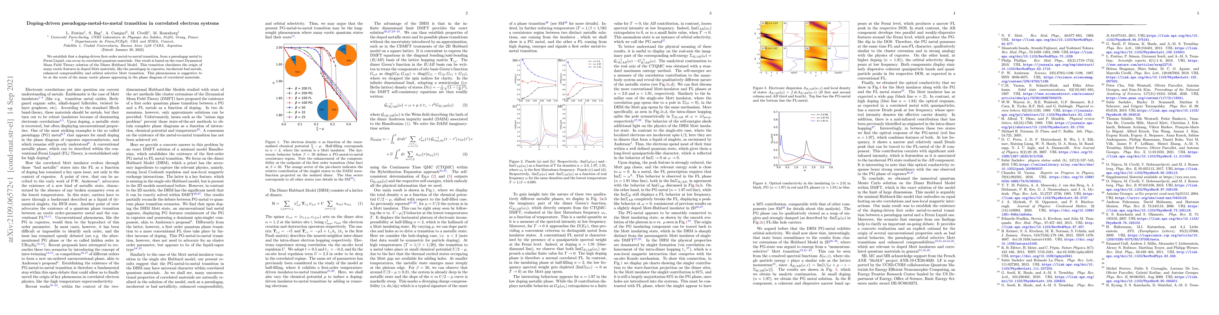 This study reveals a doping-induced first-order transition from a pseudogap metal to a Fermi Liquid in correlated quantum materials, using the Dimer Hubbard Model and exact Dynamical Mean Field Theory. This transition sheds light on the origins of various exotic phenomena in doped Mott insulators.