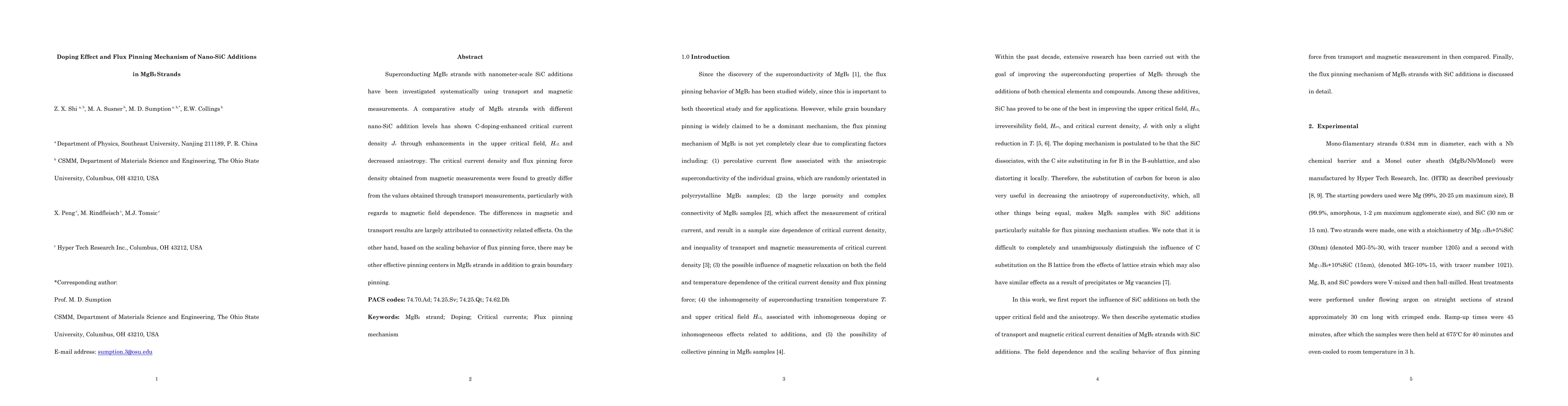 This study investigates the impact of nano-SiC additions on MgB2 superconducting strands, finding enhanced critical current density due to C-doping and decreased anisotropy. Discrepancies between transport and magnetic measurements highlight connectivity effects and suggest additional pinning centers beyond grain boundaries.