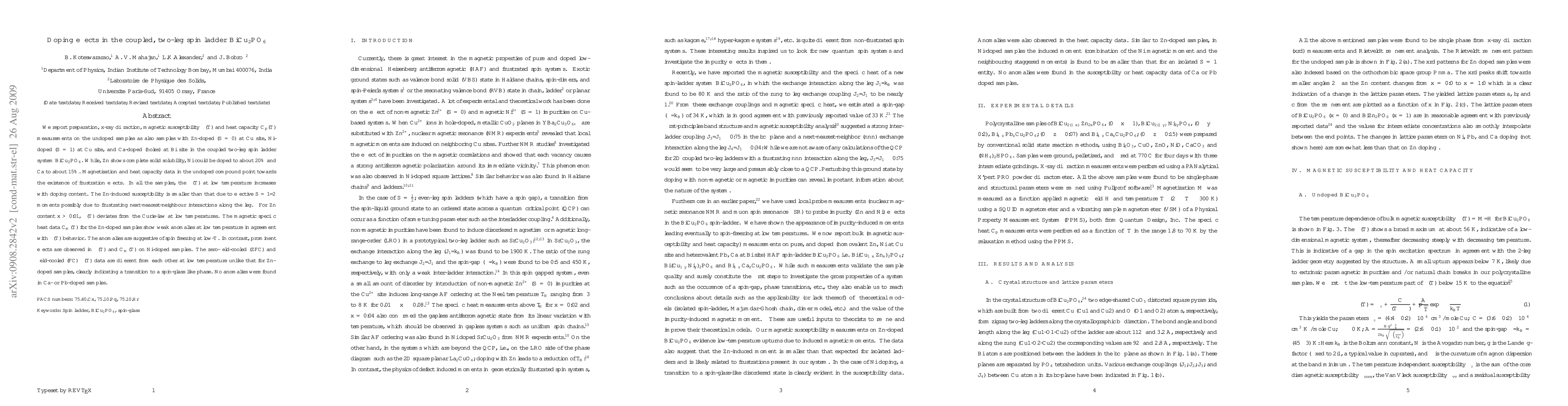 This study investigates doping effects in the spin ladder compound BiCu2PO6 using Zn, Ni, and Ca doping. Zn and Ni doping show significant changes in magnetic susceptibility and heat capacity, with Ni leading to spin-glass phase transitions, while Zn induces spin freezing. Ca doping shows no prominent effects.