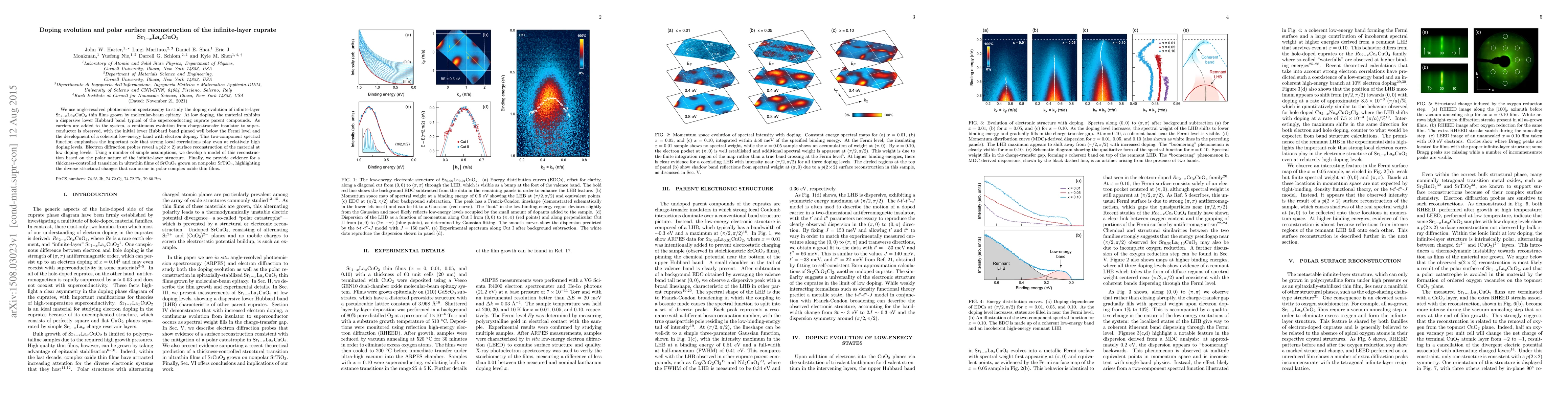 We use angle-resolved photoemission spectroscopy to study the doping evolution of infinite-layer Sr$_{1-x}$La$_{x}$CuO$_{2}$ thin films grown by molecular-beam epitaxy. At low doping, the material exhibits a dispersive lower Hubbard band typical of the superconducting cuprate parent compounds. As carriers are added to the system, a continuous evolution from charge-transfer insulator to superconductor is observed, with the initial lower Hubbard band pinned well below the Fermi level and the development of a coherent low-energy band with electron doping. This two-component spectral function emphasizes the important role that strong local correlations play even at relatively high doping levels. Electron diffraction probes reveal a ${p(2\times2)}$ surface reconstruction of the material at low doping levels. Using a number of simple assumptions, we develop a model of this reconstruction based on the polar nature of the infinite-layer structure. Finally, we provide evidence for a thickness-controlled transition in ultrathin films of SrCuO$_2$ grown on nonpolar SrTiO$_3$, highlighting the diverse structural changes that can occur in polar complex oxide thin films.