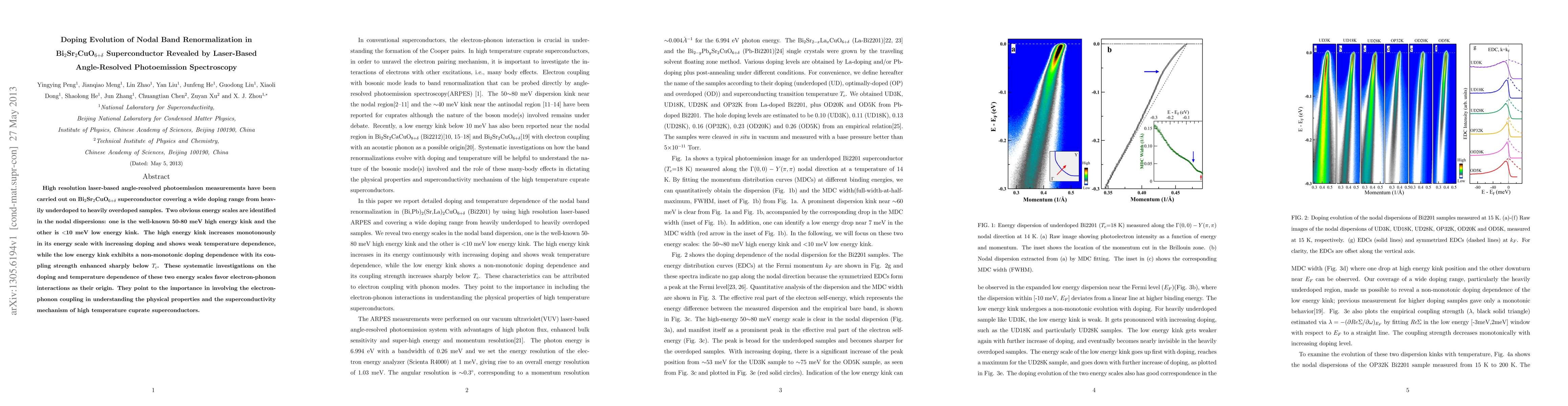 This paper investigates the doping evolution of nodal band renormalization in Bi2Sr2CuO6+d superconductors using laser-based angle-resolved photoemission spectroscopy. It identifies two energy scales in nodal dispersions, with the high energy kink increasing with doping and the low energy kink showing a non-monotonic doping dependence, suggesting electron-phonon interactions play a crucial role in high-temperature superconductivity.