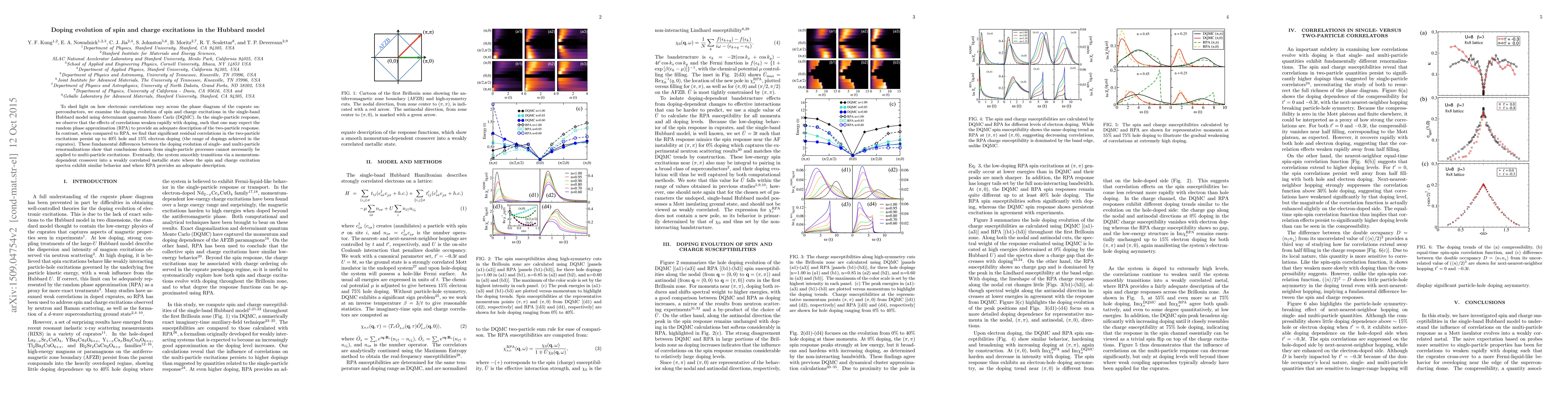 This study uses determinant quantum Monte Carlo to analyze the doping evolution of spin and charge excitations in the Hubbard model, revealing that while single-particle correlations weaken with doping, significant residual correlations in multi-particle excitations persist up to high doping levels, challenging the applicability of single-particle approximations to multi-particle processes.
