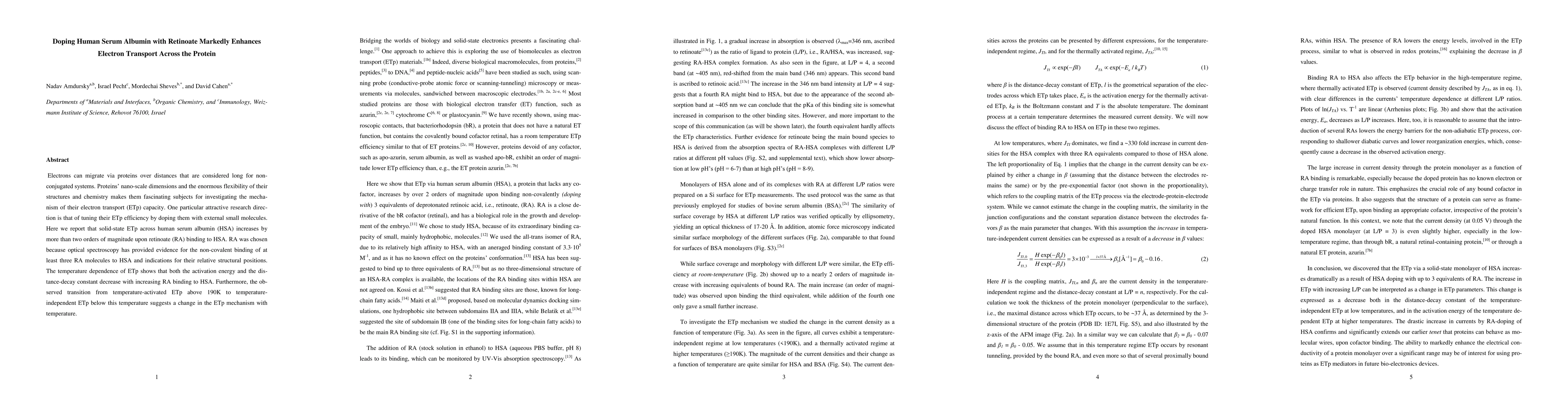 This study demonstrates that doping human serum albumin (HSA) with retinoate (RA) significantly enhances electron transport across the protein by over two orders of magnitude. The binding of RA to HSA alters the electron transport mechanism, reducing activation energy and distance-decay constant, and transitioning from temperature-dependent to independent transport below 190K.