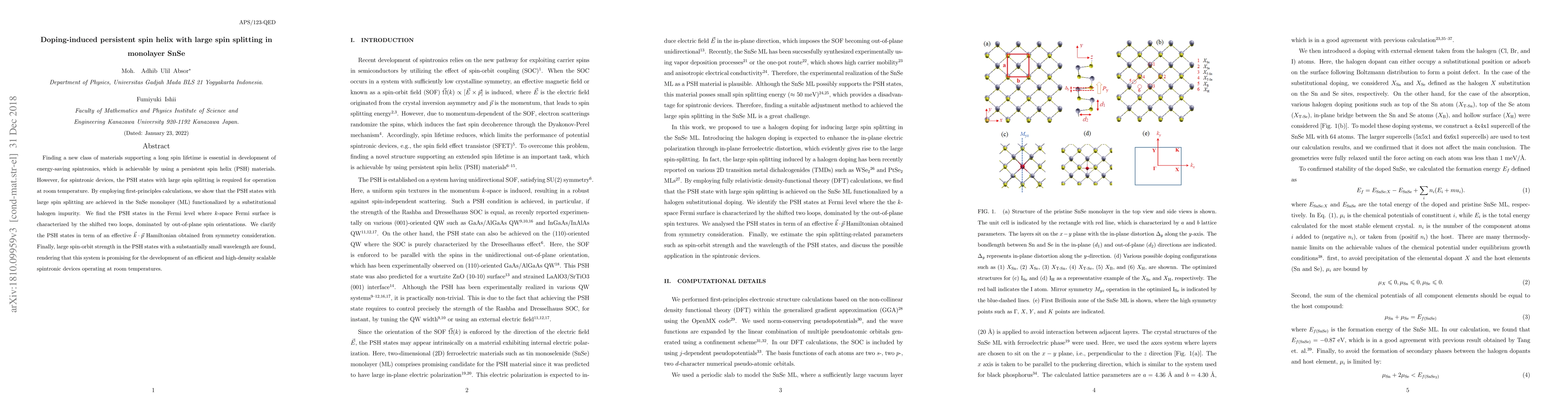 This paper demonstrates that doping monolayer SnSe with a substitutional halogen impurity can create persistent spin helix (PSH) states with large spin splitting, essential for energy-efficient spintronics. The study reveals that these PSH states, characterized by out-of-plane spin orientations, are promising for high-density, scalable spintronic devices operating at room temperature.