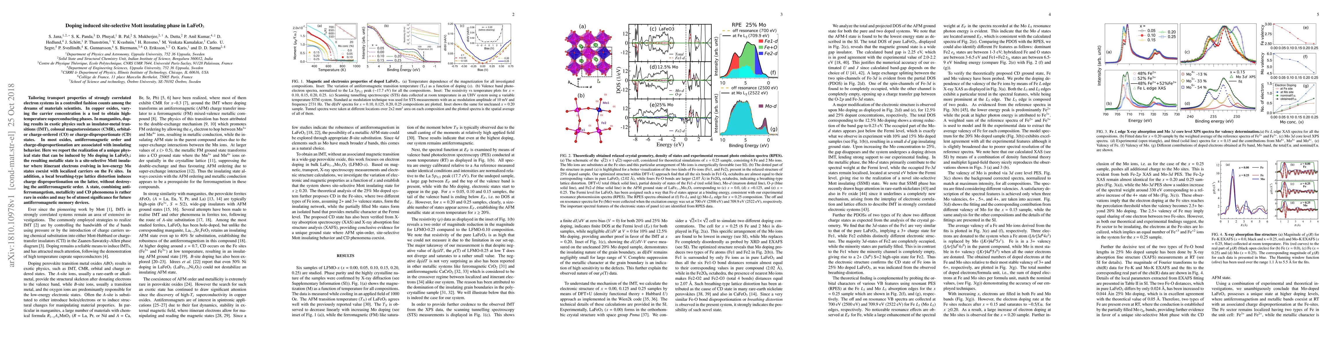 This paper reports the creation of a site-selective Mott insulating phase in doped LaFeO$_3$ through Mo doping, resulting in a metallic state where itinerant electrons coexist with localized carriers, alongside a rare combination of antiferromagnetism, metallicity, and charge disproportionation. This unique state may hold potential for advanced antiferromagnetic memory devices.
