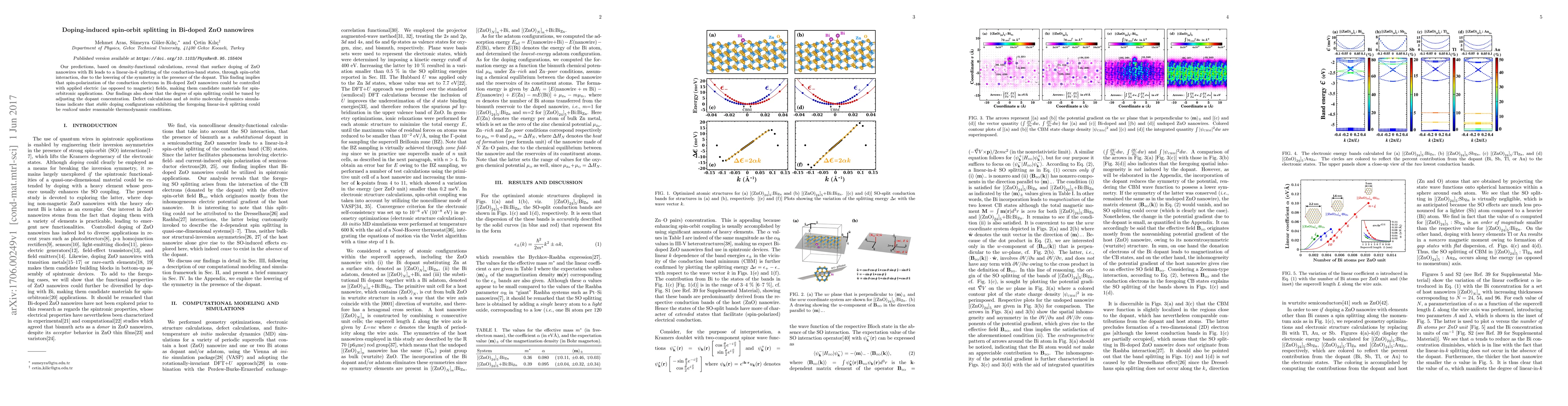 This study reveals that Bi doping in ZnO nanowires induces spin-orbit splitting in the conduction band, enabling spin polarization control via electric fields. The degree of spin splitting is tunable by adjusting the dopant concentration, suggesting potential for spin-orbitronic applications.