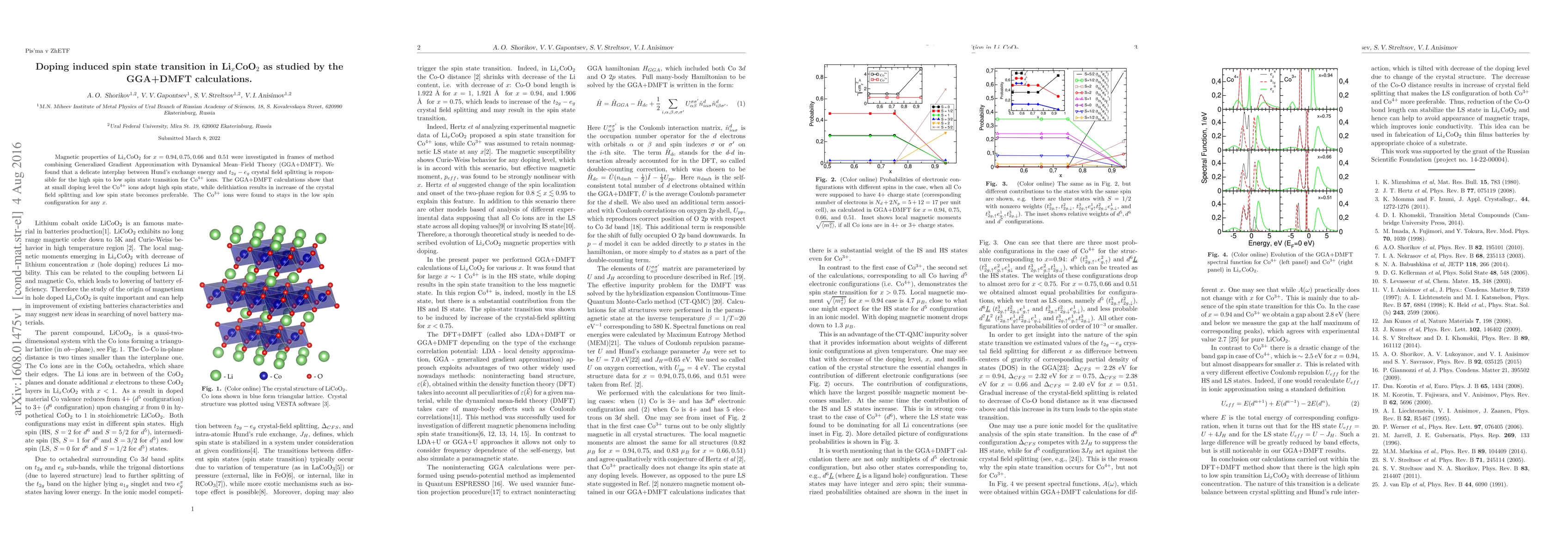 Researchers used a combination of Generalized Gradient Approximation and Dynamical Mean-Field Theory to study Li$_x$CoO$_2$, finding that doping levels affect the spin state transition of Co$^{4+}$ ions between high spin and low spin states, with delithiation favoring the low spin configuration.